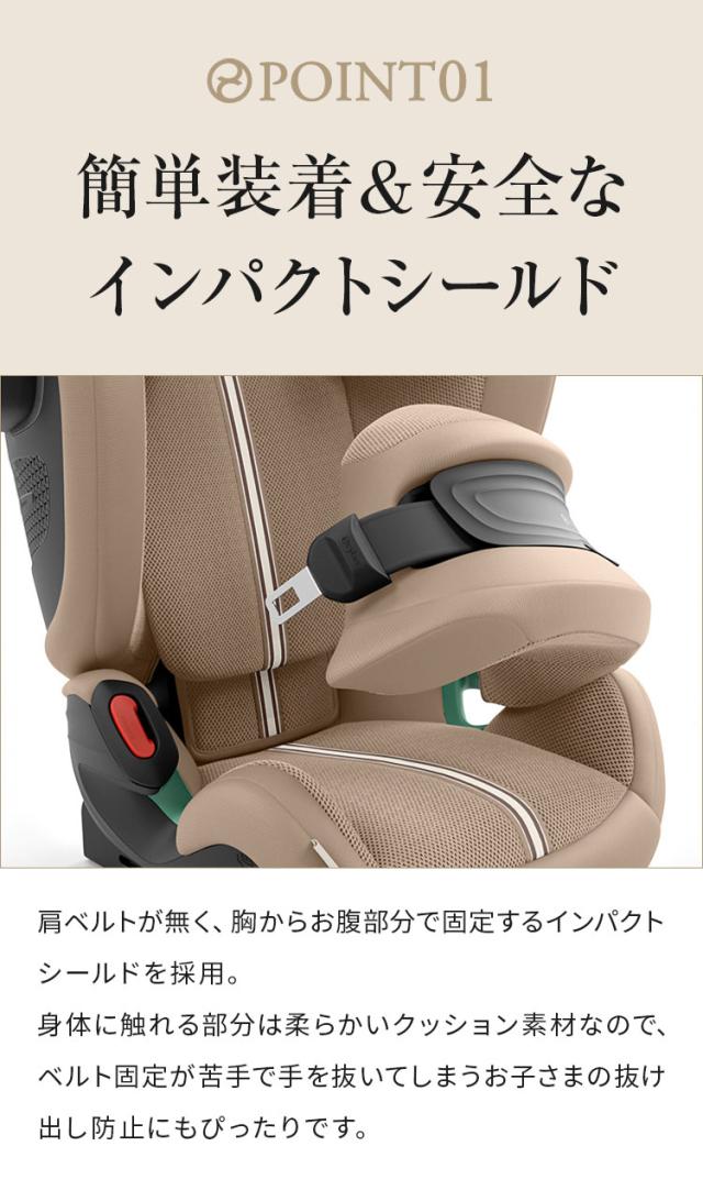 インパクトシールドを備えた前向き装着の「パラス G2」は、1台で最大約10年使用できるロングユースタイプ。チャイルドシートモードからジュニアシートモードへの切り替えも、インパクトシールドを取りはずすだけで完了します。