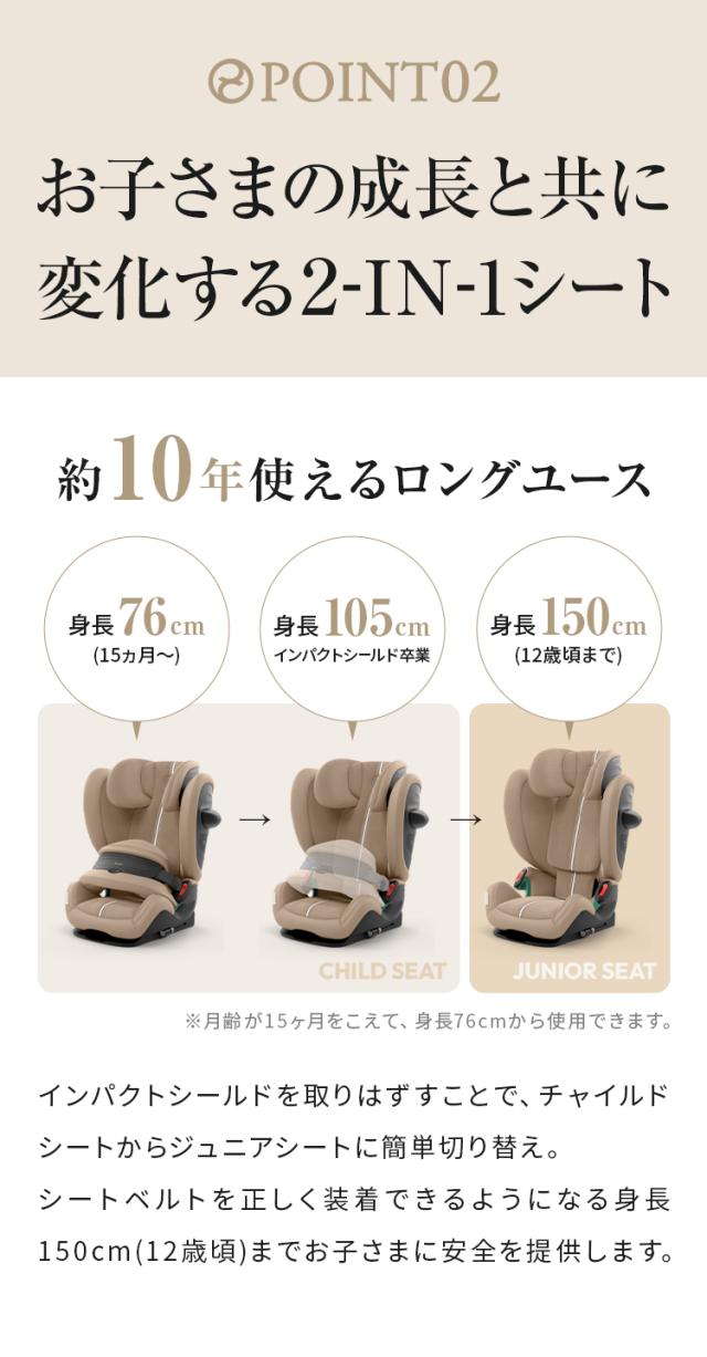 お子さまの成長とともに変化する2-IN-1カーシートで、生後15ヵ月から12歳頃(身長150cm)まで長くお使いいただけます。