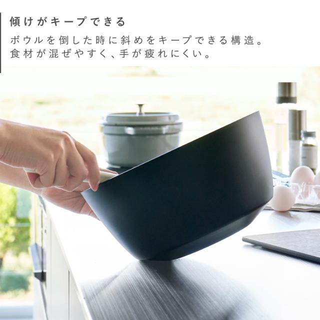 斜めに傾けて軽く手で持つだけで安定して混ぜやすい調理ボウルLサイズ。ボウルを傾けた時に斜めをキープできる構造で、食材が混ぜやすく手が疲れにくいです。