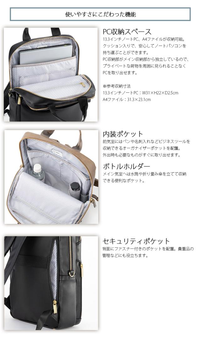 13.3インチノートPC、A4ファイルが収納可能。 クッション入りで、安心してノートパソコンを持ち運ぶことができます。 PC収納部がメイン収納部から独立しているので、プライベートな荷物を周囲に見られることなくPCを取り出せます。