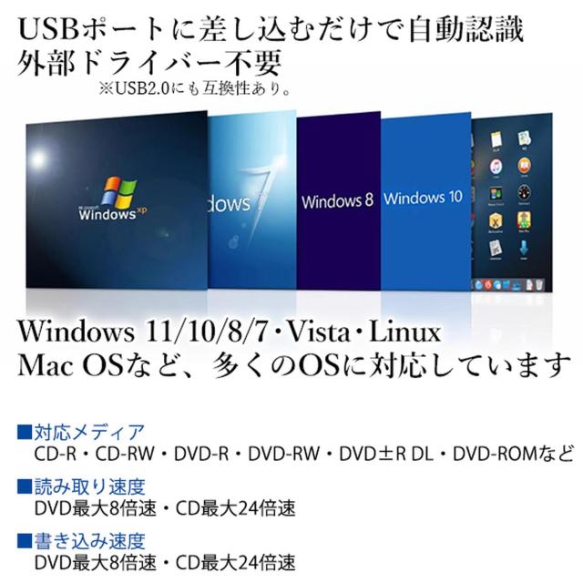 読み取り速度: DVD最大8倍速、CD最大24倍速