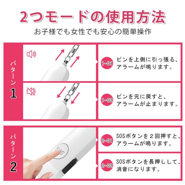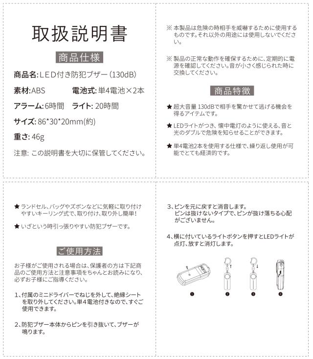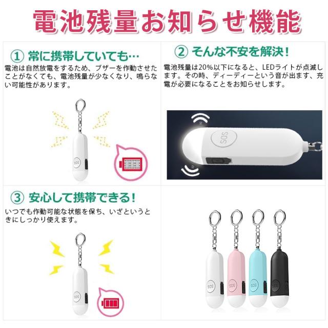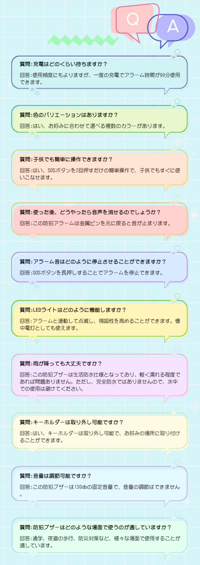 Q1: 充電はどのくらい持ちますか? A1: 使用頻度にもよりますが、一度の充電でアラーム時間が90分使用できます。 Q2: 色のバリエーションはありますか? A2: はい、お好みに合わせて選べる複数のカラーがあります。 Q3: 子供でも簡単に操作できますか? A3: はい、SOSボタンを2回押すだけの簡単操作で、子供でもすぐに使いこなせます。 Q4:使った後、どうやったら音声を消せるのでしょうか? A4:この防犯アラームは金属ピンを元に戻ると音が止まります。 Q5: アラーム音はどのように停止させることができますか? A5: SOSボタンを長押しすることでアラームを停止できます。 Q6: LEDライトはどのように機能しますか? A6: アラームと連動して点滅し、視認性を高めることができます。懐中電灯としても使えます。 Q7:雨が降っても大丈夫ですか? A7:この防犯ブザーは生活防水仕様となっており、軽く濡れる程度であれば問題ありません。ただし、完全防水ではありませんので、水中での使用は避けてください。 Q8: キーホルダーは取り外し可能ですか? A8: はい、キーホルダーは取り外し可能で、お好みの場所に取り付けることができます。 Q9: 音量は調節可能ですか? A9: この防犯ブザーは130dbの固定音量で、音量の調節はできません。 Q10: 防犯ブザーはどのような場面で使うのが適していますか? A10: 通学、夜道の歩行、防災対策など、様々な場面で使用することが適しています。 |