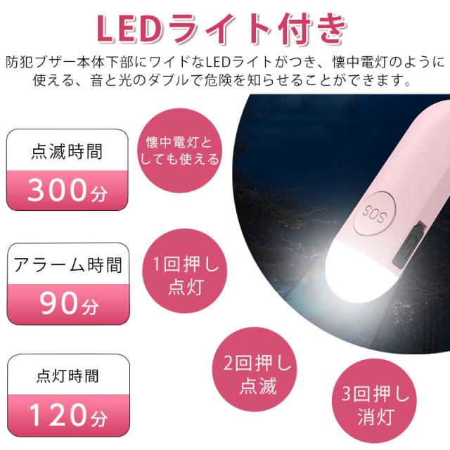 【明るいLEDライト付き】防犯ブザー本体下部にワイドなLEDライトがつき、 懐中電灯のように使える、音と光のダブルで危険を知らせることができます。また暗い場所で作業するときや、家の鍵を取り出すときも便利です。ライトは点灯モードと点滅モードの2パターン。