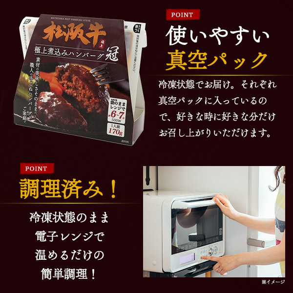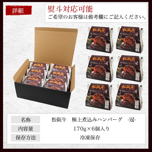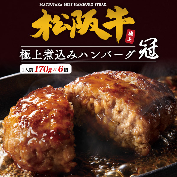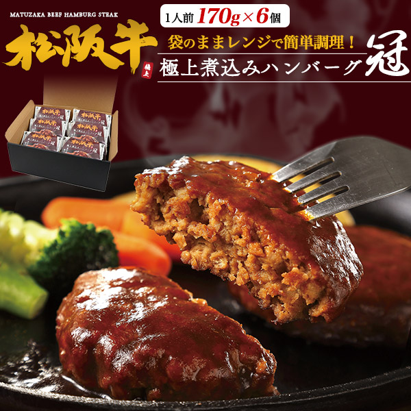 肉 ギフト お歳暮 松阪牛 煮込み ハンバーグ 「冠」 6個セット 170g×6個 袋のままま レンチン 簡単調理 国産 牛肉 個包装 冷凍 はんばーぐ 贈答用 贈物 内祝 御祝い 誕生日 冷凍配送 送料無料 黒毛和牛 松坂牛 高級 和牛 冷凍食品 一人暮らし