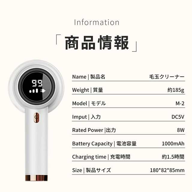 | 仕様 | ◆型番:M-2 ◆定格入力電圧:DC5V ◆バッテリー容量:1,000mAh ◆製品サイズ:約180*82*85mm ◆製品重量:185g ◆パケージ内容:毛玉クリーナー本体*1、掃除用ブラシ*1、 充電用USBケーブル*1、刃*1 |