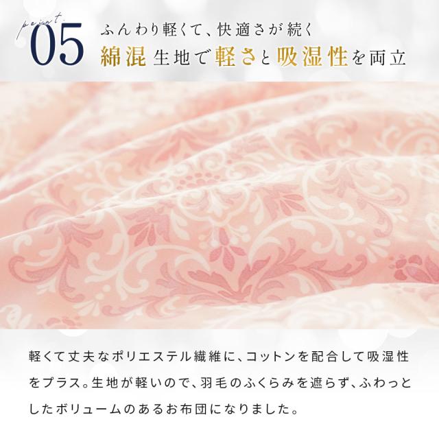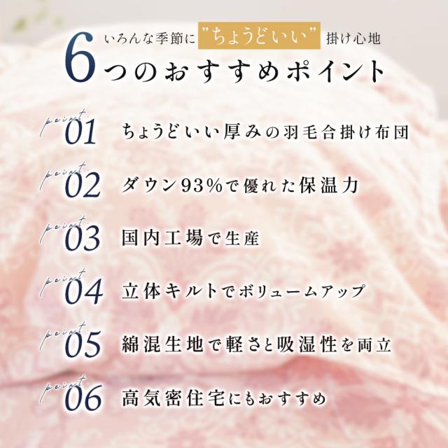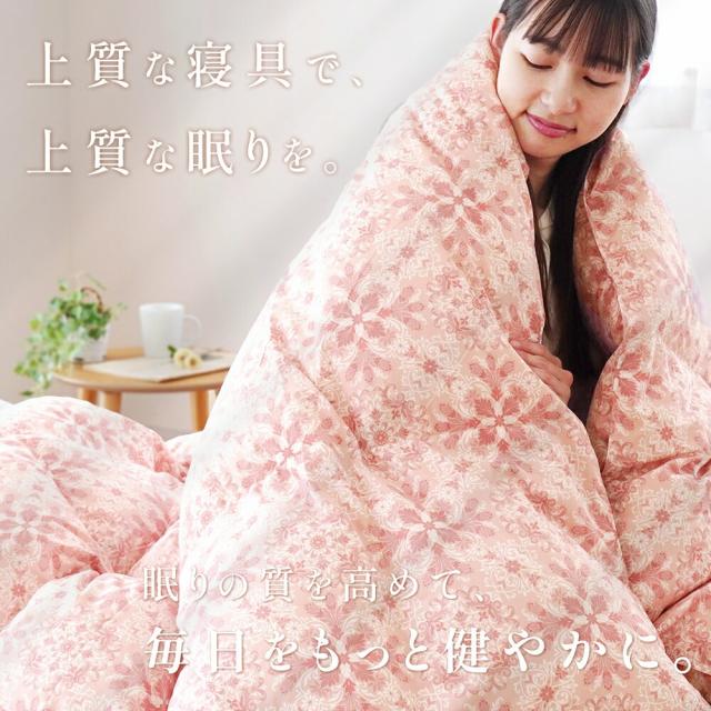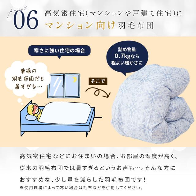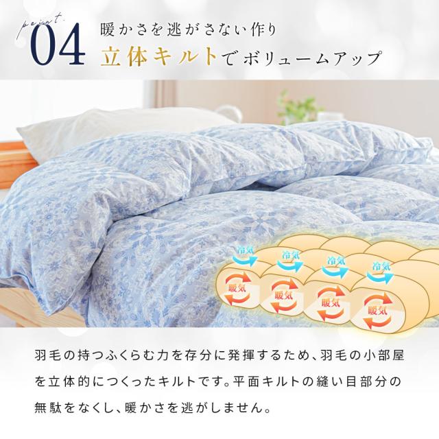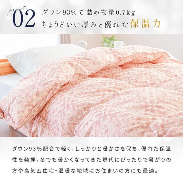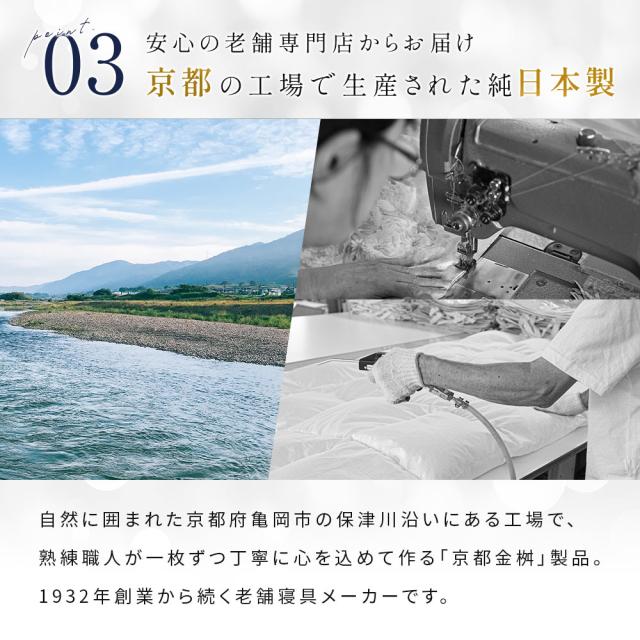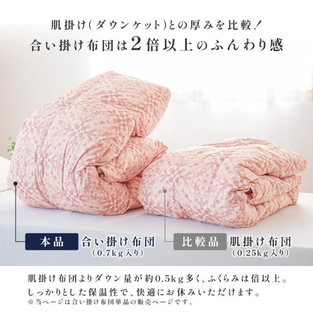 | ・こんな厚みが欲しかった…。中厚タイプの”ちょうどいい”羽毛布団 秋〜初冬や、晩冬〜春のおふとん選びが難しい時期に適した合い掛けタイプ。肌掛けでは物足りないけど、冬掛けでは暑すぎる…。そんな季節の変わり目にもぴったりな一枚です! ・ダウン93%で詰め物量0.7kg。ちょうどいい厚みと優れた保温力ダウン93%配合で軽く、しっかりと暖かさを保ち、優れた保温性を発揮。冬でも暖かくなってきた現代にぴったりで、暑がりの方や高気密住宅・温暖な地域にお住まいの方にも最適。 ・安心の老舗専門店からお届け!京都の工場で生産された純日本製自然に囲まれた京都府亀岡市の保津川沿いにある工場で、熟練職人が一枚ずつ丁寧に心を込めて作る「京都金桝」製品。1932年創業から続く老舗寝具メーカーです。 ・暖かさを逃がさない作り。立体キルトでボリュームアップ羽毛の持つふくらむ力を存分に発揮するため、羽毛の小部屋を立体的につくったキルトです。平面キルトの縫い目部分の無駄をなくし、暖かさを逃がしません。 ・ふんわり軽くて、快適さが続く。綿混生地で軽さと吸湿性両立軽くて丈夫なポリエステル繊維に、コットンを配合して吸湿性をプラス。生地が軽いので、羽毛のふくらみを遮らず、ふわっとしたボリュームのあるお布団になりました。 ・高気密住宅(マンションや戸建て住宅)にマンション向け羽毛布団高気密住宅などにお住まいの場合、お部屋の湿度が高く、従来の羽毛布団では暑すぎるというお声も…。そんな方におすすめな、少し量を減らした羽毛布団です! 合い掛け布団と肌掛け布団を重ねることで、約1.0kgの贅沢ボリュームに。寒い冬でも使える2枚合わせの掛け布団に変身!1年中快適さが続き、長くお使いいただけます。 | |