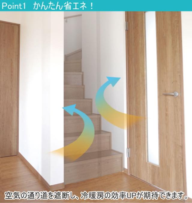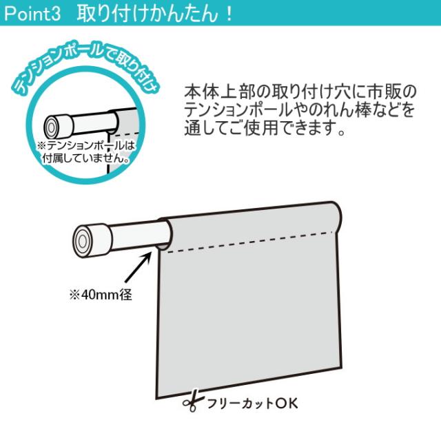 本製品は、市販のテンションポールや、のれん棒を使って取り付けるのれんタイプの間仕切りです。 お部屋の間仕切りだけでなく、台所や洗面所・脱衣所などの間仕切りとしてもご使用いただけます。 室内への熱気・冷気の侵入を抑え、冷暖房効率をアップします。 ハサミでカットできます。 ■その他の結露・防寒対策はこちら↓ 結露・防寒対策 |