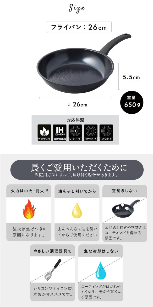 安全・安心だけのセラミックコーティングではなく、焦げ付きにくさ、耐摩耗性、遠赤、硬度、抗菌、消臭など機能性に優れた今までにないまったく新しいセラミックコーティングを採用したフライパンです。