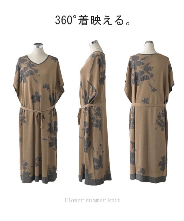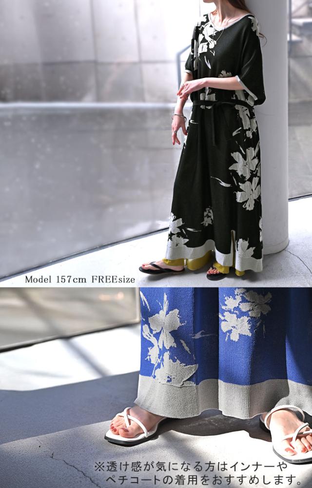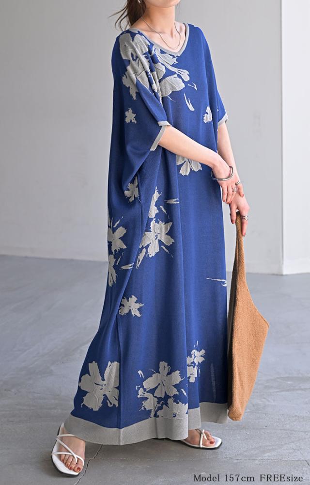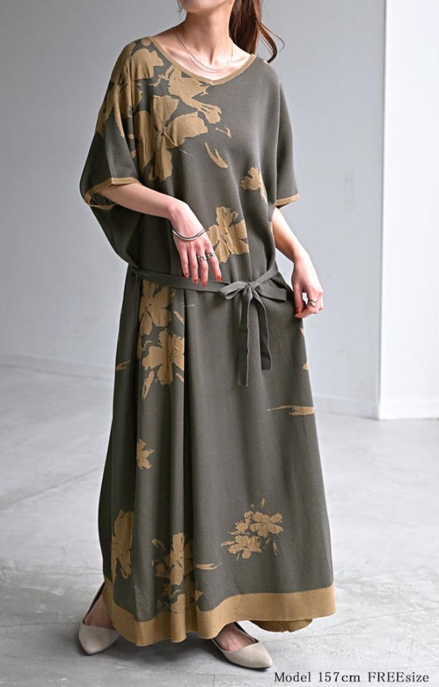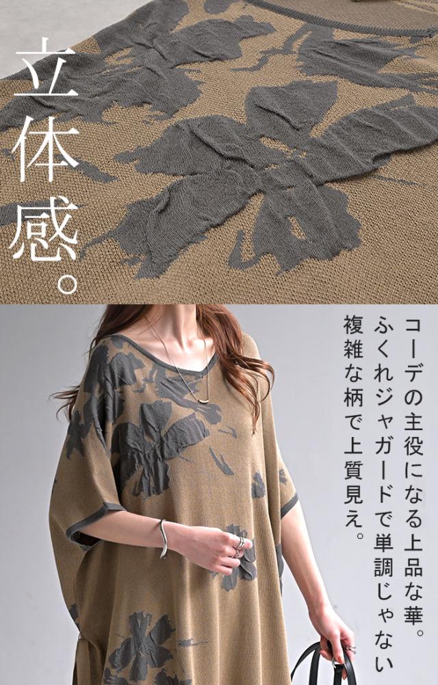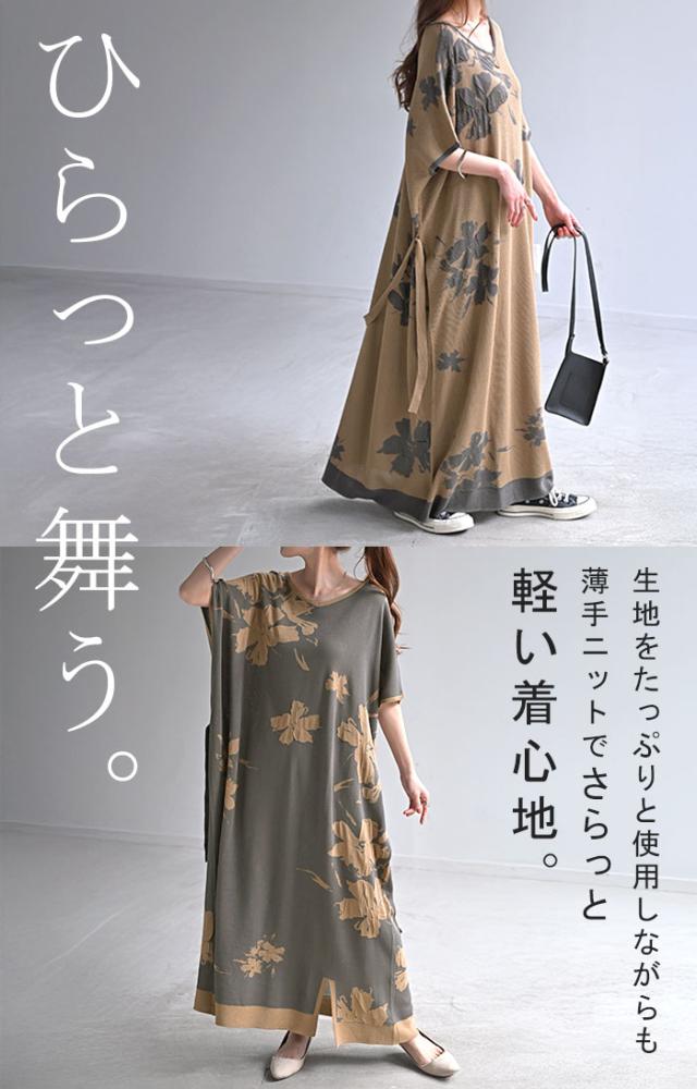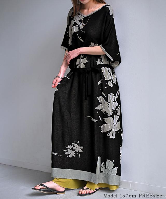 ざっくり着られて花柄が目を惹くニットワンピースです。