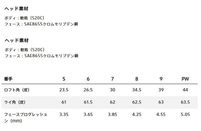 ■フェースプログレッション(mm):3.35(#5)3.65(#6)3.85(#7)4.25(#8)4.55(#9)5.05(PW)