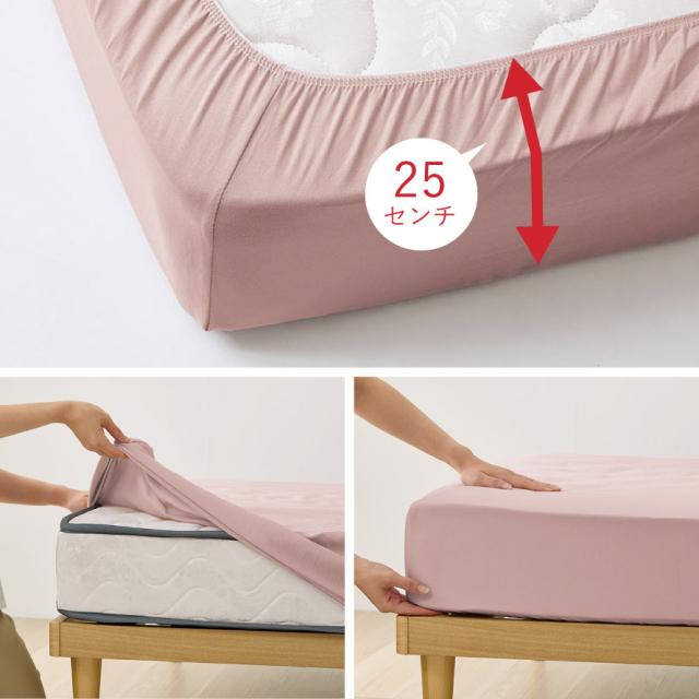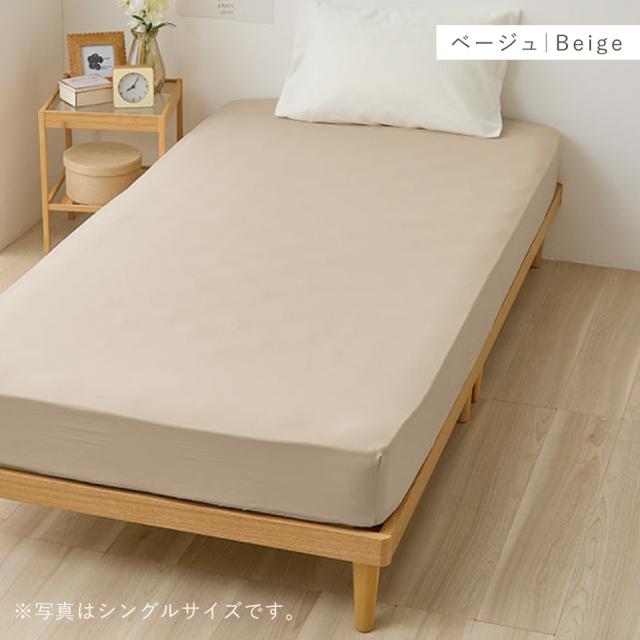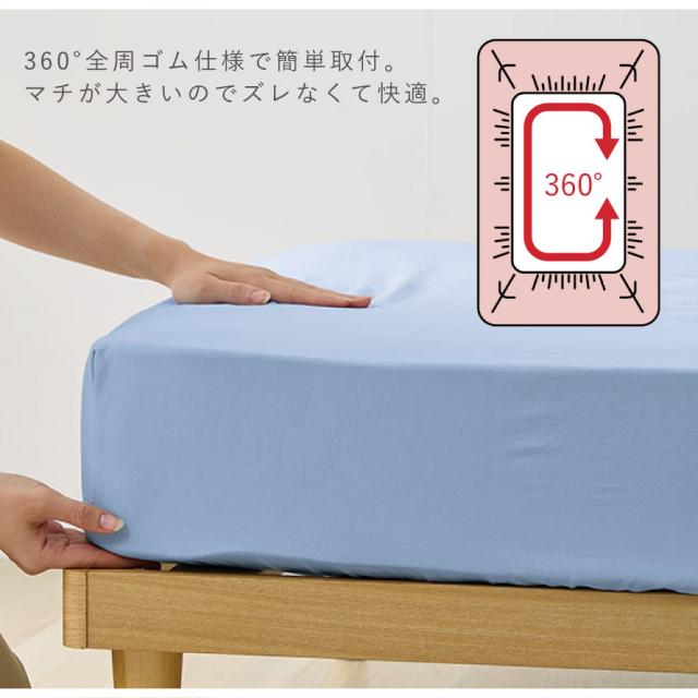 柔らかで優しい肌触り。心地よく寝心地快適なシンプルなシーツ。裏面に周囲ゴム仕様で、マットレスにしっかりフィットし、ズレにくい。引っ掛けるだけで装着でき、シーツ交換が手軽にできます。