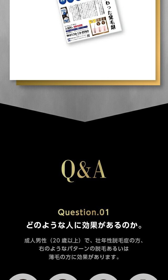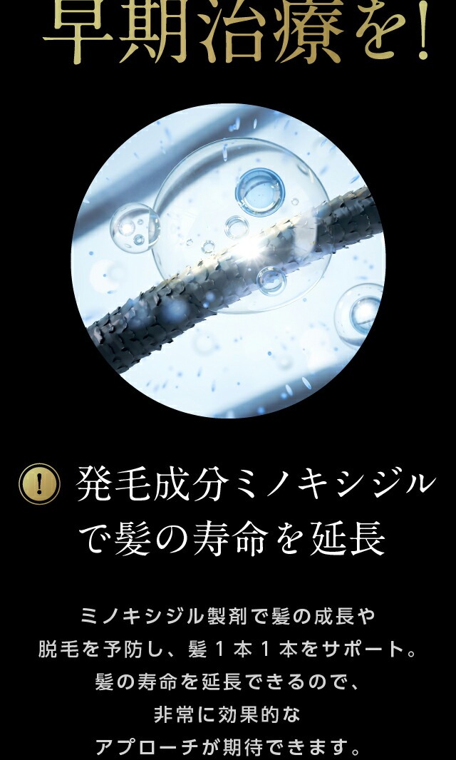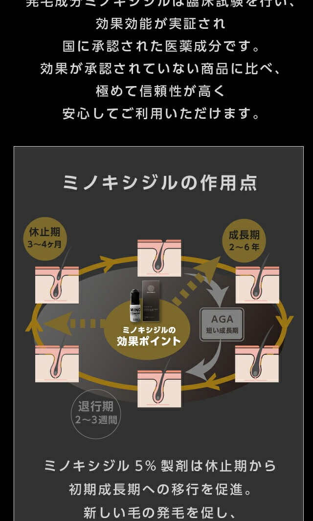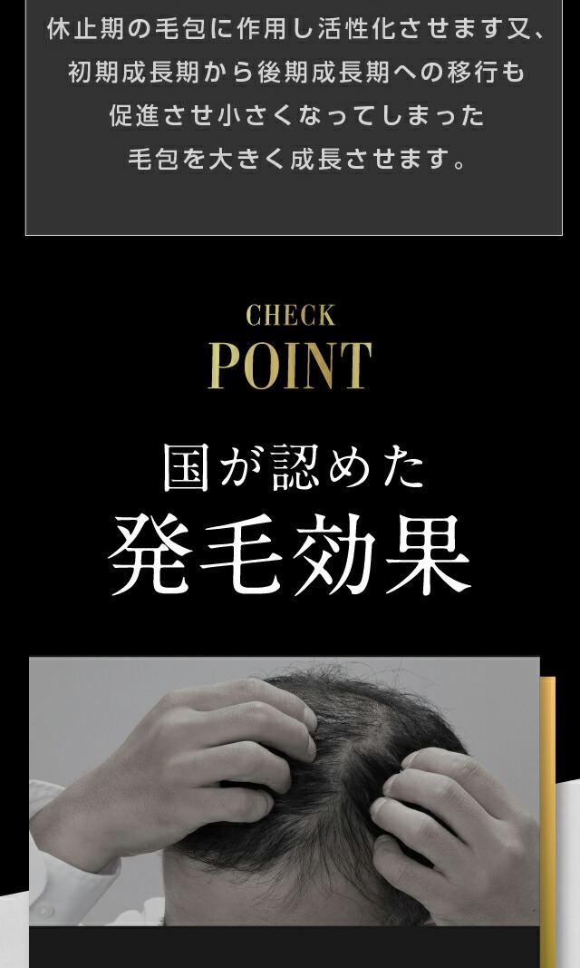 ○毛包を大きくして毛幹を太くし毛髪の成長期を刺激することで発毛を促進します。