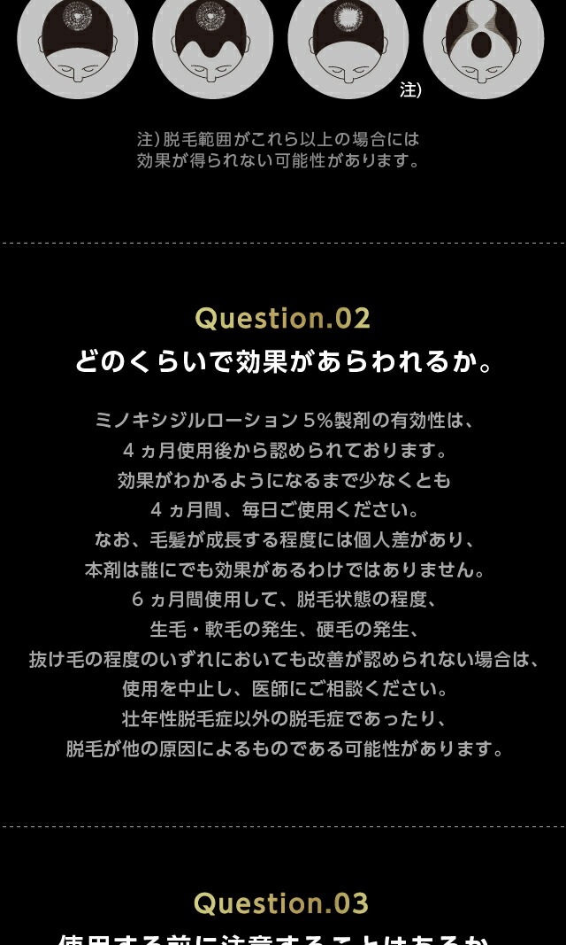 4.使用開始後6ヵ月以内であっても、脱毛状態の悪化や、次のような脱毛が見られた場合は、使用を中止し、この説明書を持って医師又は薬剤師に相談してください。