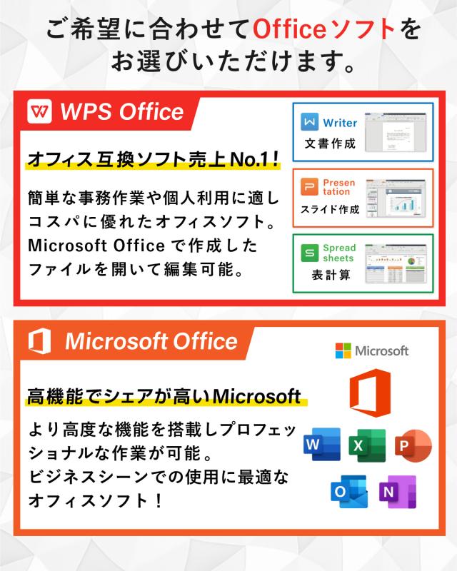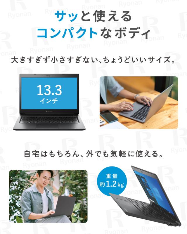 | 中古ノートパソコン3つのオススメポイント 【1】高性能・高コスパの中古ノートパソコン プロのスタッフにより中古ノートパソコンの外装・内部の清掃はもちろん、ストレージをSSDに交換しWindowsをインストールしているので、従来のHDDに比べて動作は快適。古いノートパソコンの様に起動や動作にストレスを感じさせません!またプロのスタッフによる動作確認済み&設定済み中古ノートパソコンの為、到着後電源ボタンを押したらすぐにご使用頂けます。 【2】ショップレビュー投稿数約8,500件突破 中古パソコン、中古ノートパソコンを「お客様から買ってよかった」の声を多数頂いております!皆様のレビューはスタッフ一同嬉しく目を通しております!頂いたご意見は今後の参考にさせて頂いておりますので、どしどしレビュー投稿をお待ちしております。 【3】7日間は着払いで返品可能! 思っていたのとなんか違う...そんな不安も必要ありません。安心の7日間返品保証がございますので、お試し購入も可能です!詳しくは会社概要からご確認ください。 こちらの中古ノートパソコンは、パソコンの一般的な用途【インターネット、メール送受信、ネットショッピング、YoutubeやNetflix、Ticktokなどの動画視聴、Excel、Word、PowerPointなどのOfficeソフト(Microsoft Office 搭載の場合)、Twitter、InstagramなどのSNS閲覧、投稿】など問題なくご使用頂けます。 |