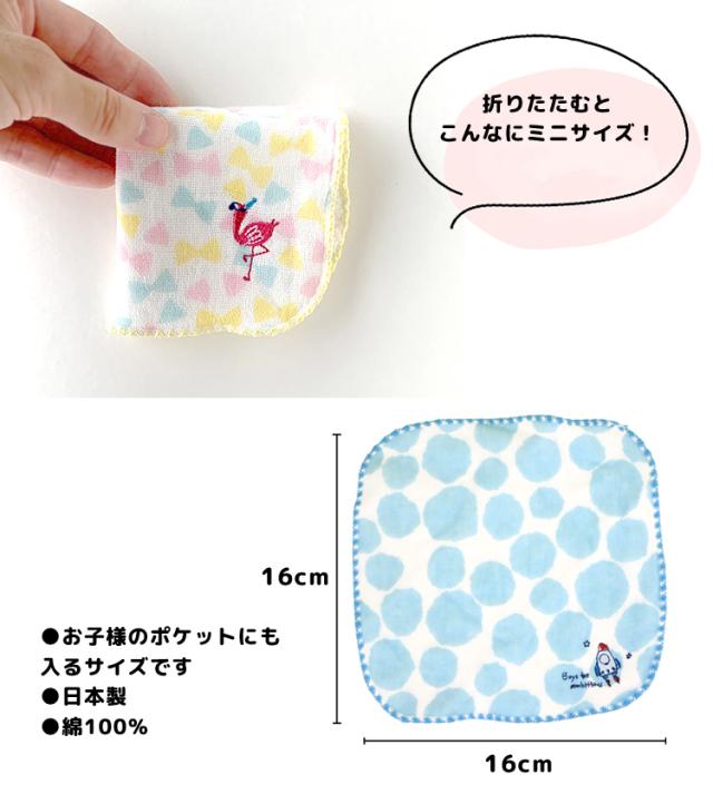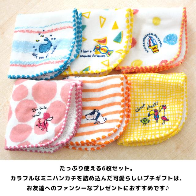 今治産 ミニハンカチ 6枚セット 16×16cm 小さめ かさばらない ガーゼ タオルハンカチ ハンカチタオル 刺繍入り 日本製 綿100% キッズ 子供 ポケットタオル 吸水 速乾 軽い ギフトセット プレゼント 男の子 女の子 保育園 幼稚園 入園 入学