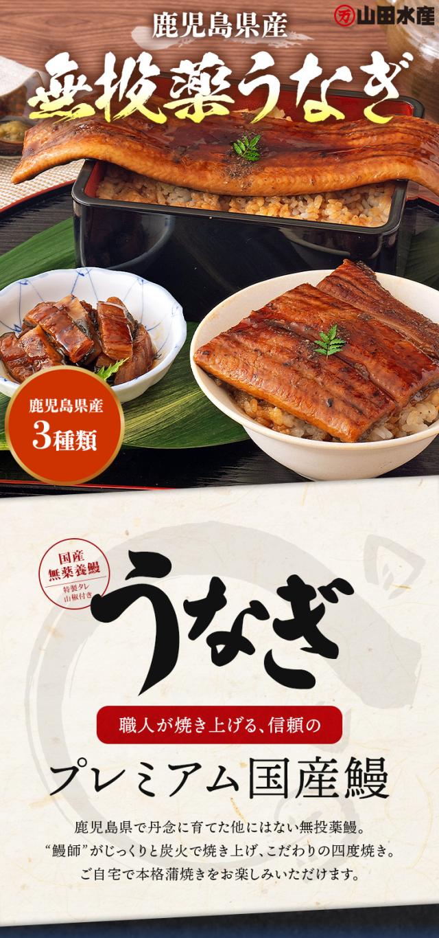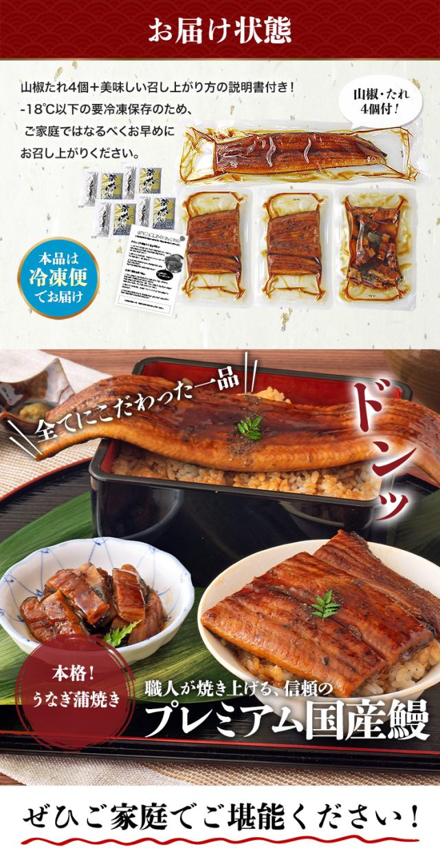 うなぎ(鹿児島県)、しょうゆ(大豆・小麦を含む)、砂糖、みりん、水あめ、発酵調味料