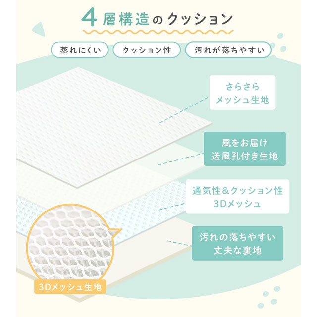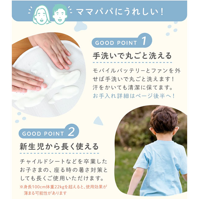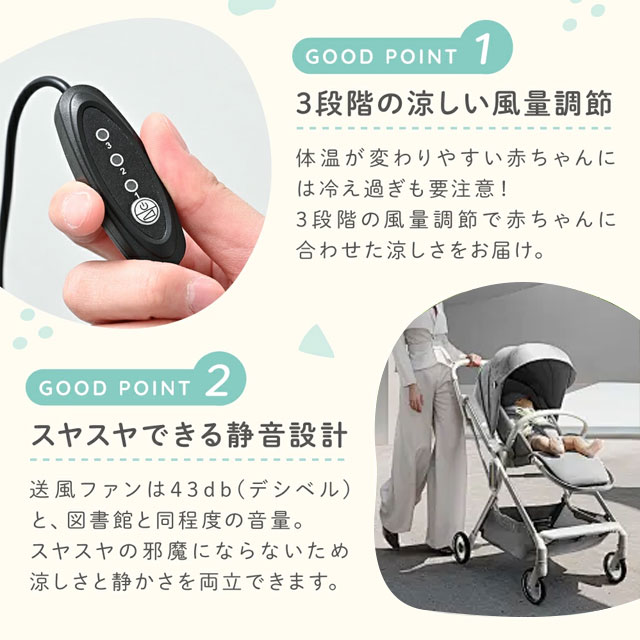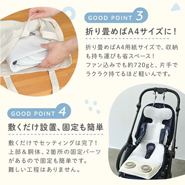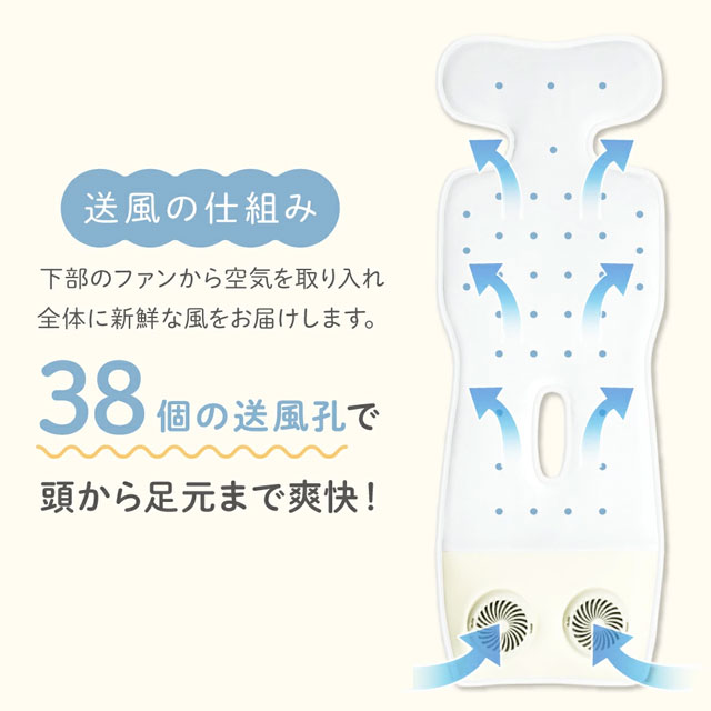 | 製品特徴 | ◆38個の送風孔で全身が爽快! ◆ベビーカー、チャイルドシート、ベビーベッド、バウンサーなど幅広く使えます! ◆敷くだけで簡単に設置できます! ◆通気性抜群の4層構造でクッションも抜群! ◆汚れても手洗いで丸ごと洗える ◆ファンは眠りを妨げない静音設計 ◆心地良い風量を3段階調節 ◆隙間4mmの安全なファンカバー |