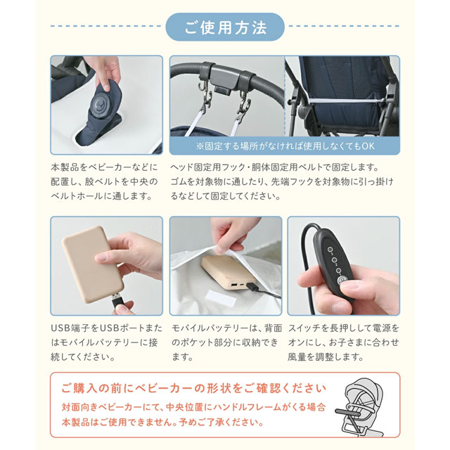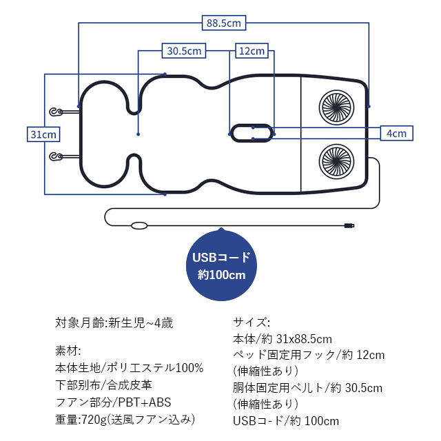 | 製品仕様 | ◆対象月齢 新生児〜4歳 ◆材質 本体生地/ポリエステル100% 下部別布/合成皮革 ファン部分/PBT+ABS ◆寸法 本体/約 31×88cm ヘッド固定用フック/約 14cm(伸縮性あり) 胴体固定用ベルト/約 35cm(伸縮性あり) USBコード/約 100cm |