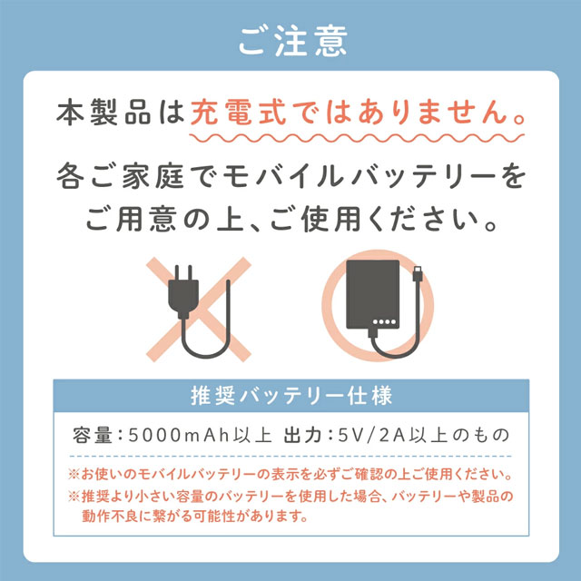 | 注意事項 | ◆用途以外でのご使用はおやめください。 ◆子供が医療機器をご使用中の場合、医師と相談の上ご使用ください。 ◆使用中に異変等を感じた際は、すぐに使用を中断してください。 ◆液体が エアラブ 内部に入った場合、機器を十分に乾燥させた後にご使用中ください。(ファンに液体が入ると故障の原因になります) ◆洗濯時は必ずファンを分離して洗濯してください。 ◆お手入れの際は必ず手洗いしてください。 |