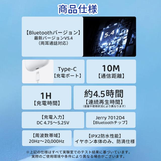 ●カラー:ホワイト、ブラック ●チップ:ジェリー7003D8 ノイズキャンセリング + 光感知入り耳検出 ●Bluetoothバージョン:Bluetooth5.4 ●動作周波数:2.402-2.480GHz ●周波数応答:20〜20000Hz ●スピーカー単位:ΦF13チタン合金膜、32Ω±15%、7.118±3DB 5mW ●マイク:2718シリコンマイク -42±3dB ●通信距離:15M【障害物なし】 ●バッテリータイプ:3.7Vポリマー電池380mAH(保護板付き、3C急速充電バッテリー)、イヤホン電池30mAh ●充電時間:1時間 ●イヤホンの動作時間:実測100%音量で連続再生約5.5時間 ●充電ケースチップ:7014チップ + A5チップ ●イヤホン重量:約62.5g(ケース含む) ●イヤホンのサイズ:約60×45×23mm ●充電ケースのサイズ:約45.2×60.3×23mm 測り方により、寸法は若干のばらつきがあります。予めご了承ください。 ●通信距離:約15〜20メートル (障害物なし) 使用環境や使用状況によって異なります。 |