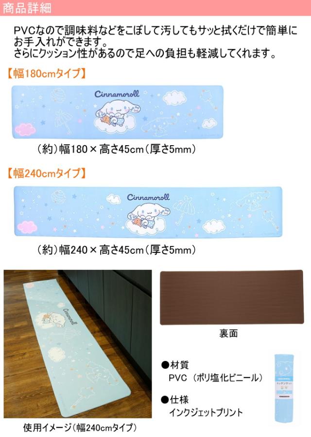 PVCなので調味料などをこぼして汚してもサッと拭くだけで簡単にお手入れができます。 パイル生地のマットとは違いお洗濯も不要です。 さらにクッション性があるので足への負担も軽減してくれます。 マット裏面はすべり止め加工がされていますので、小さなお子様がいるご家庭でも安心。 キャラクターのデザインがとってもかわいくて、家でも使いやすい商品となっております。 ※イメージ画像と実際の商品では色合い等多少異なる場合がございますが、予めご了承ください。 ※新柄のクロミ(総柄)は薄いグレーのようなの色味です。 ■その他のキッチンマットはこちら↓ キッチンマット |