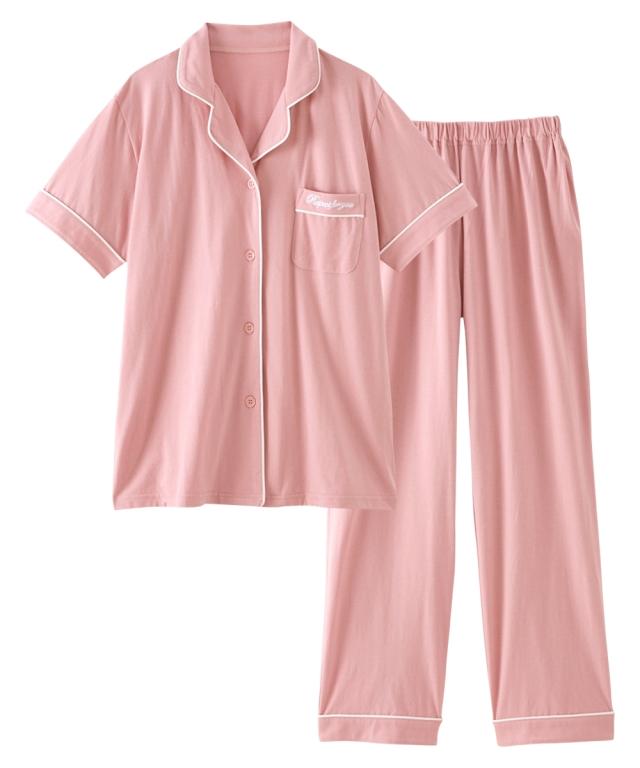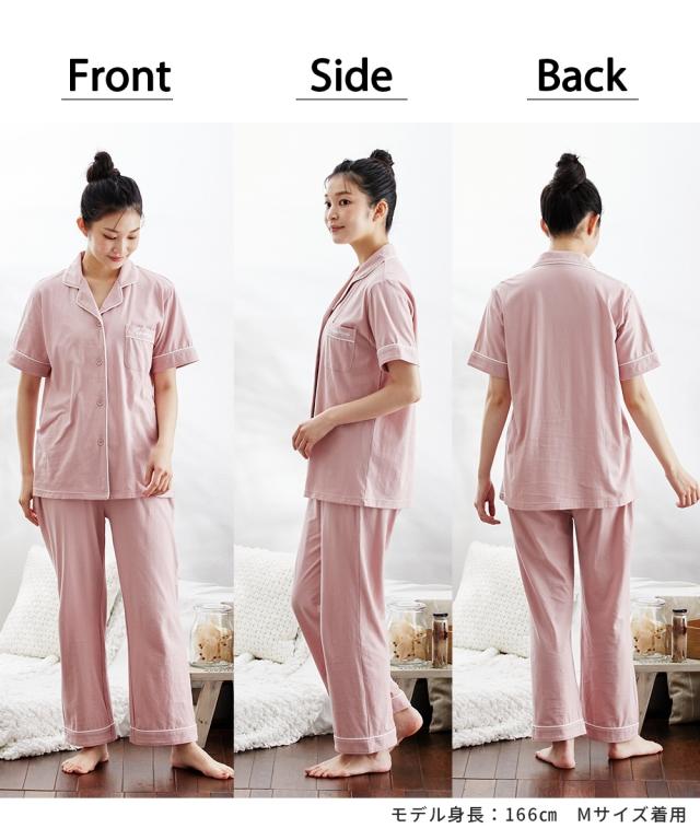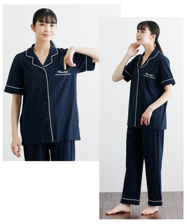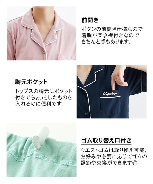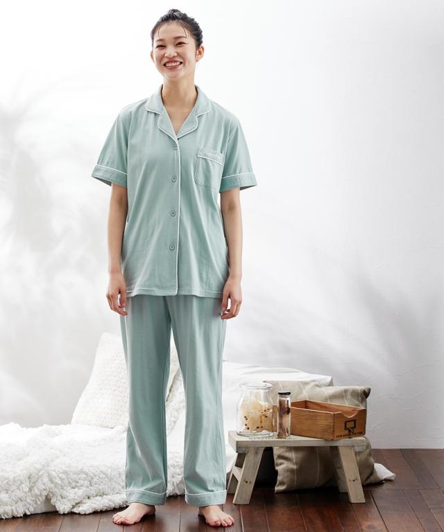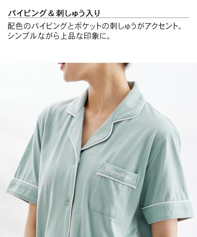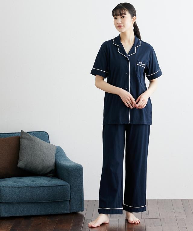 ☆寝る時こそ選びたい、肌にやさしい綿100%パジャマ&ルームウェア☆ 肌ざわりのよい、さらっとした綿100%の天竺素材。天竺ニットはTシャツにも使われる薄手で伸縮性のある素材。綿は通気性や吸水性に優れており、蒸れにくく快適な着心地です。前開きのボタン仕様で着脱がラク。テーラー襟できちんと感があり、白のパイピングもアクセント。胸元にポケット付き。刺しゅう入りがポイント。ちょっと長め袖丈の半袖と、ロング丈のストレートボトムで長く着用いただけます。 【おすすめポイント】 ■肌にやさしい天然素材の綿100% SZ天竺を使用し、なめらかでさらっとした肌触り。ほどよい伸縮性があり、パジャマにちょうどいい素材です。綿は通気性や吸水性に優れており、快適な着心地です。 ■前開きシャツタイプ ボタンの前開き仕様なので着脱が楽 テーラー襟できちんと感もあります。 ■胸元ポケット トップスの胸元に小さめポケット付き。スマホなどちょっとしたものを入れるのに便利です。 ■こだわりのデザイン 襟、袖口、ポケット、足口のパイピングがアクセント。ポケットにはさりげない刺しゅう入り。シンプルながら上品でおしゃれ感ある仕上がりに。 ■ウエストゴムは取り換え可能