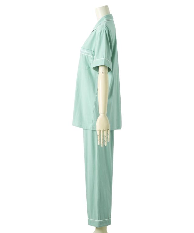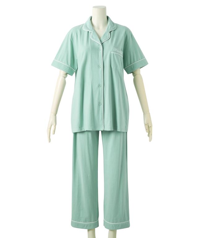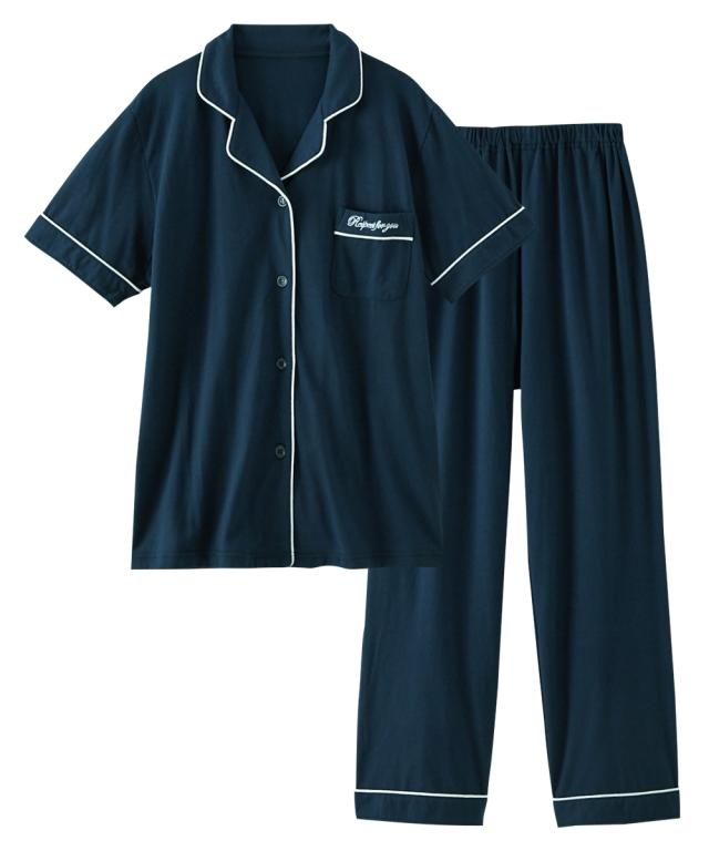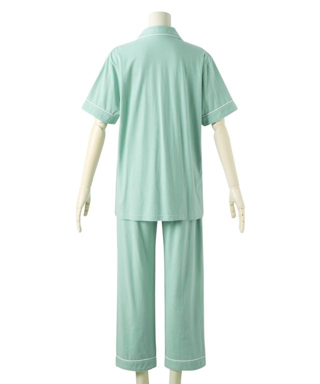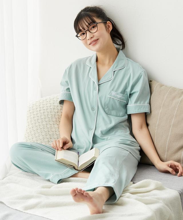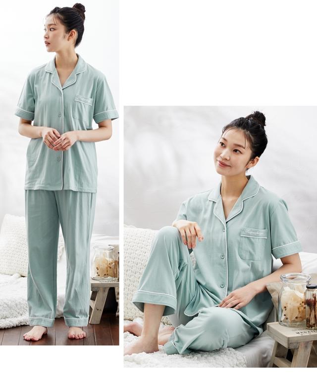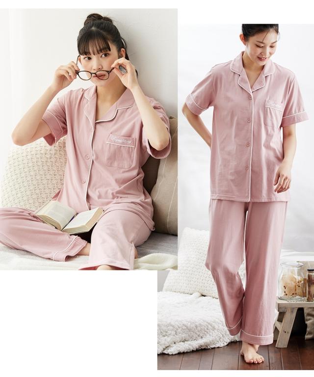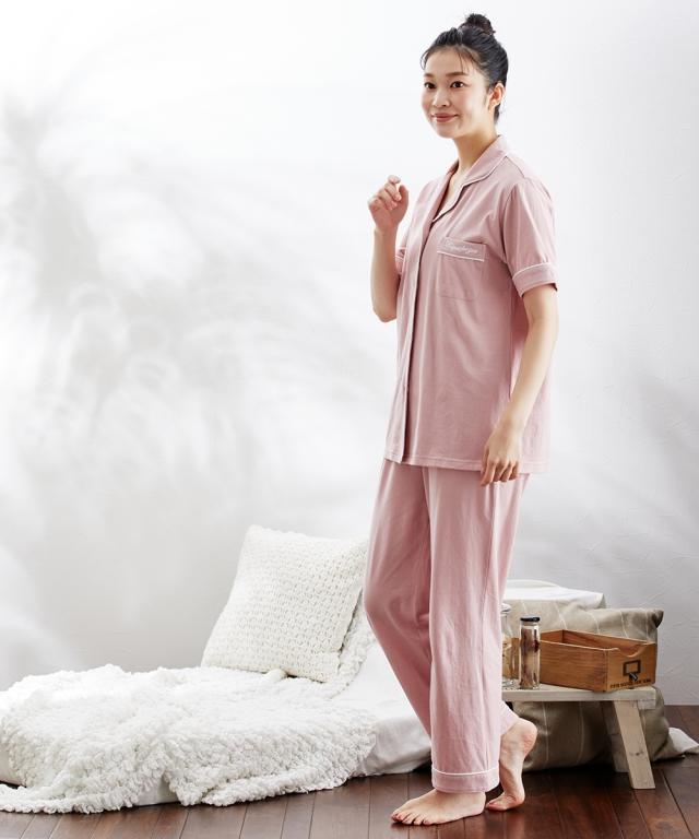 ☆寝る時こそ選びたい、肌にやさしい綿100%パジャマ&ルームウェア☆ 肌ざわりのよい、さらっとした綿100%の天竺素材。天竺ニットはTシャツにも使われる薄手で伸縮性のある素材。綿は通気性や吸水性に優れており、蒸れにくく快適な着心地です。前開きのボタン仕様で着脱がラク。テーラー襟できちんと感があり、白のパイピングもアクセント。胸元にポケット付き。刺しゅう入りがポイント。ちょっと長め袖丈の半袖と、ロング丈のストレートボトムで長く着用いただけます。 【おすすめポイント】 ■肌にやさしい天然素材の綿100% SZ天竺を使用し、なめらかでさらっとした肌触り。ほどよい伸縮性があり、パジャマにちょうどいい素材です。綿は通気性や吸水性に優れており、快適な着心地です。 ■前開きシャツタイプ ボタンの前開き仕様なので着脱が楽 テーラー襟できちんと感もあります。 ■胸元ポケット トップスの胸元に小さめポケット付き。スマホなどちょっとしたものを入れるのに便利です。 ■こだわりのデザイン 襟、袖口、ポケット、足口のパイピングがアクセント。ポケットにはさりげない刺しゅう入り。シンプルながら上品でおしゃれ感ある仕上がりに。 ■ウエストゴムは取り換え可能