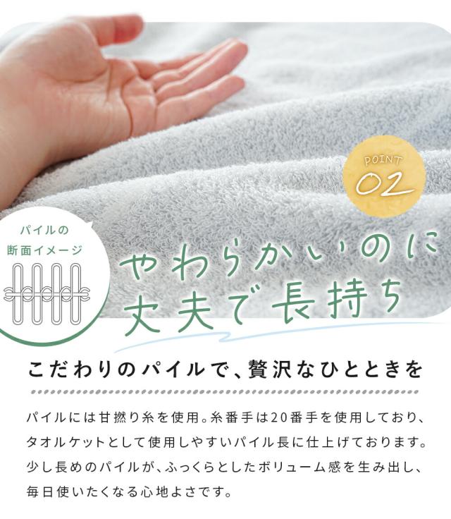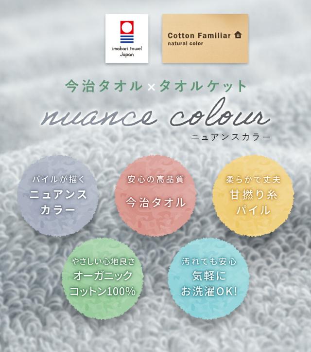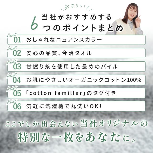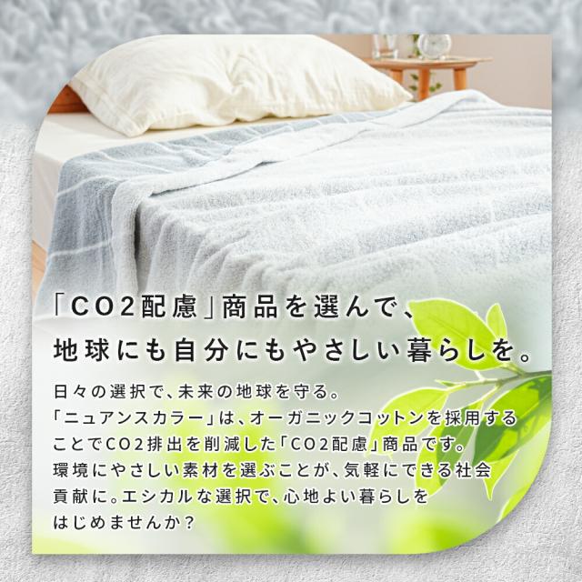 | ・「CO2配慮」商品を選んで地球にも自分にもやさしい暮らしを 日々の選択で、未来の地球を守る。「ニュアンスカラー」は、オーガニックコットンを採用することでCO2排出を削減した「CO2配慮」商品です。環境にやさしい素材を選ぶことが、気軽にできる社会貢献に。エシカルな選択で、心地よい暮らしを始めませんか? ・オシャレで心地いい一枚、ニュアンスカラーについて「オシャレで心地いい」デザインのこだわり。パイルのニュアンスカラー(グラデーション)が、光や角度によって美しく変化し、タオル生地の表情が移ろう景色を生み出します。さりげないオシャレと特別な風合いを楽しめる一枚です。 ・やわらかいのに丈夫で長持ち、こだわりパイルで贅沢なひとときを。パイルには甘撚り糸を使用。糸番手は20番手を使用しており、タオルケットとして使用しやすいパイル長に仕上げております。少し長めのパイルが、ふっくらとしたボリューム感を生み出し、毎日使いたくなる心地よさです。 ・お肌にやさしい、地糸を含めてオーガニックコットン100%「PBP YARN PROJECT」対象のインド産オーガニックコットンを使用。オーガニックコットンは、従来のコットン栽培に比べてCO2排出量を削減できる可能性があり、環境負荷を軽減します。さらに綿農家の支援や教育支援などSDGsの取り組みに貢献します。一般財団法人PBP COTTONと株式会社ヤギが共同運営するこのプロジェクトを通じて、持続可能な未来を支える一歩を、あなたとともに。 ・ワンポイントで魅せるオシャレ、「cotton famillar」のタグ付き当社限定の「cotton famillar」タグ付きデザイン。上質な素材とこだわりの縫製で、毎日快適にお使いいただけます。 | |