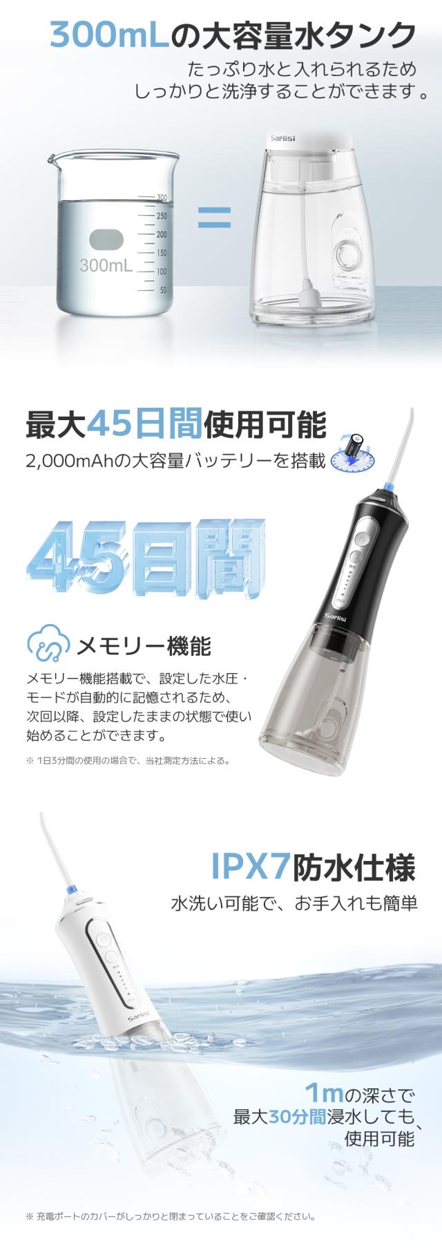 本製品は、300mlの大容量タンクを備え、持ちやすいハンディタイプで、1回の給水ですべての歯間に行き渡る。