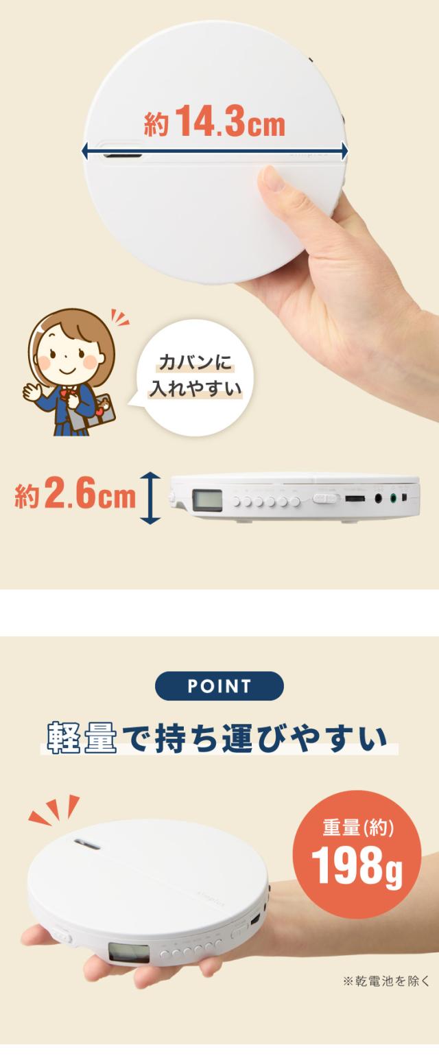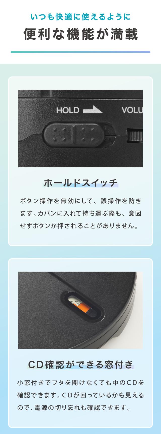 CDプレーヤー、ポータブルCDプレーヤー、音楽プレーヤー、オーディオプレーヤー、語学学習、CD学習、英語、勉強、リスニング、ヒアリング、TOEIC、TOEFL、英検、入試、受験勉強、簡単操作、使いやすい、誤作動防止機能、音飛び防止、早送り、早戻し、リピート再生、イントロ再生、プログラム再生、重低音、2WAY電源、乾電池、USB給電、家庭用コンセント、携帯、持ち運び、小型、コンパクト、薄型、子供、高齢者、学生イヤホン付き、シンプル、おしゃれ、オシャレ