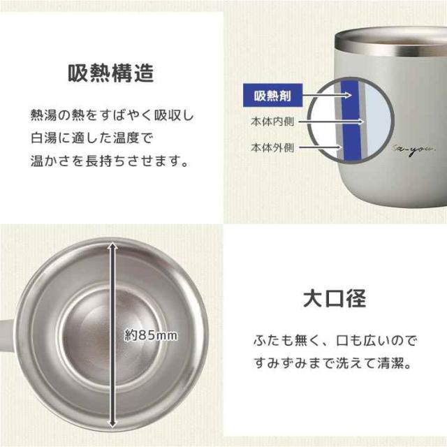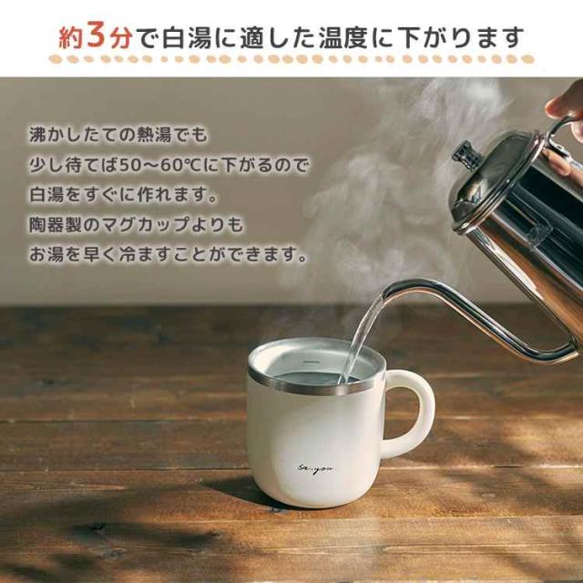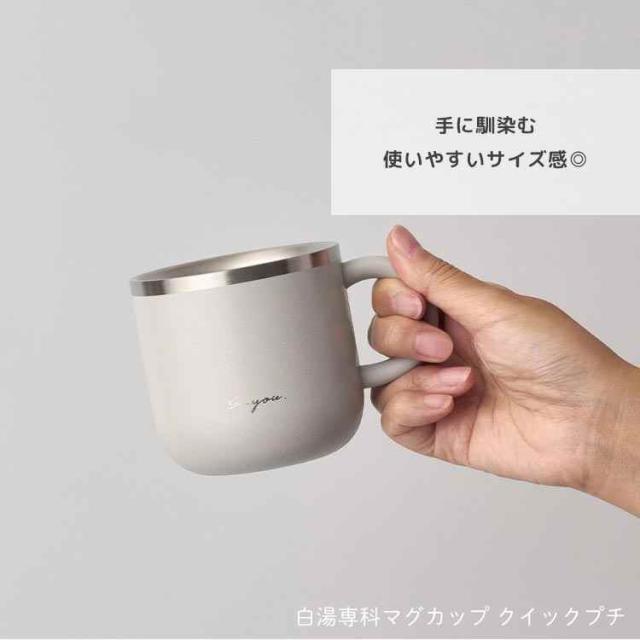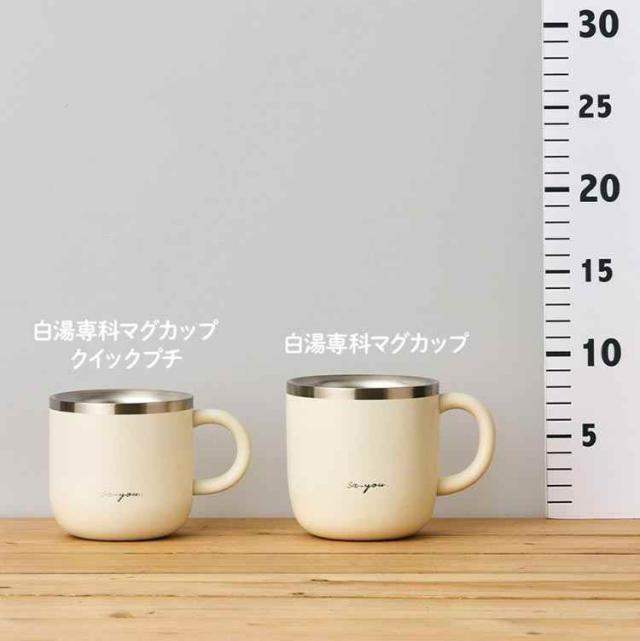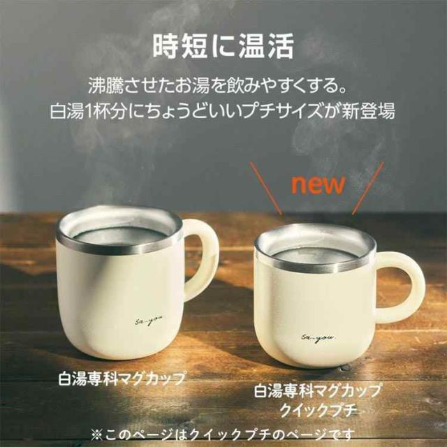 沸騰させたお湯を冷まして白湯を作るのは時間がかかる・・・。そんなお悩みを解決できる白湯専用のマグカップです。従来品より一回り小さい230mlのプチサイズ。吸熱剤入りのステンレス製で、沸騰させた熱湯でもカップに注いで約3分で適温となり、約1時間飲みやすい温度を保ちます。温活にもぴったりなので、大切な人へのプレゼントにもおすすめのアイテムです◎