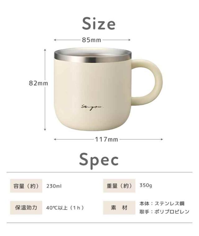 Details 【白湯マグ クイックプチ 230】 沸騰させたお湯を冷まして白湯を作るのは時間がかかる・・・。そんなお悩みを解決できる白湯専用のマグカップです。従来品より一回り小さい230mlのプチサイズ。吸熱剤入りのステンレス製で、沸騰させた熱湯でもカップに注いで約3分で適温となり、約1時間飲みやすい温度を保ちます。温活にもぴったりなので、大切な人へのプレゼントにもおすすめのアイテムです◎ ブランド名 DOSHISHA / ドウシシャ 品番 OZSM230 サイズ 約W85×D117(持ち手込み)×H82mm 容量 約230mL 重量 約255g 素材 本体:ステンレス鋼(吸熱剤入り) 取っ手:ポリプロピレン 生産国 中国 ご注意 ※表記サイズより、多少の誤差があることがございます。 ※商品の画像はできる限り実物に近づけるよう配慮しておりますが、お使いのモニターやご覧になる環境によりましてはカラーの見え方に差が出る場合がございます。ご了承くださいませ。 関連キーワード マグカップ DOSHISHA ドウシシャ 白湯専科 保温 おしゃれ かわいい ステンレス タンブラー 230ml クイックプチ OZSM230 GY IV PB 白湯マグ 白湯専用 コップ カップ 温活 グッズ グレー ピンクベージュ アイボリー 吸熱剤 お湯 保温マグ 湯冷まし ダイエット ギフト 簡単 食器 白湯専用のマグカップ オンドゾーン ON℃ZONE 母の日 お祝い 時短 オフィス さゆマグ さゆ 3分 適温 蓋なし ロゴ 無地 便秘解消 妊活 誕生日 プレゼント 女性 男性 雑貨 入れるだけ ワンポイント 朝活 直飲み くすみカラー | |||||||||||||||||