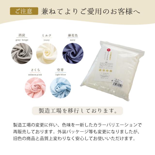 | ・洗うたび馴染むやわらかガーゼ 昔ながらの製法で手間暇かけて仕上げられるからこそ生まれる、どこか懐かしいピュアなガーゼ。繊細な肌触りの和晒ガーゼは寝汗をすっと吸ってくれて、洗濯しても乾きやすい。洗うたびに肌にすっくり馴染みどんどん身近な存在になる感じがたまらなく愛おしい。 ・伝統的な和晒(わざらし)製法綿から不純物を取り除き、漂白する作業を「晒(さらし)」と呼びます。日本伝統の晒加工である「和晒」は、巨大釜と天然水を使い、手間暇かけてじっくり4日間煮込むことで、繊維の一本一本が綿本来の丸みを保ち、ふんわりやわらかい仕上がりになります。 ・羽毛布団と相性良しあたたかいお布団とは、身体にしっかりとフィットし、かつ身体に負担を掛けない軽さが重要です。せっかくの軽い羽毛布団でも、重くて固いカバーを掛けてしまうと羽毛が上から押さえつけられて羽毛布団の機能が十分に発揮できません。羽毛布団のキルトにやわらかく寄り添い、ふわりと軽く丈夫なガーゼは、まさに羽毛布団にぴったりのカバーです。 ・安心の日本製生地の裁断から仕上げに至るまで、自社国内工場で行っていて、徹底した品質管理がなされています。 ・フィットシーツはマチ付きの敷き布団にも対応シングル・シングルロングの敷布団に対応しますし、厚み10cmくらいまでなら、マチ付きの敷き布団にも対応します。当店の健康敷きふとん系にもお勧めです。 | |