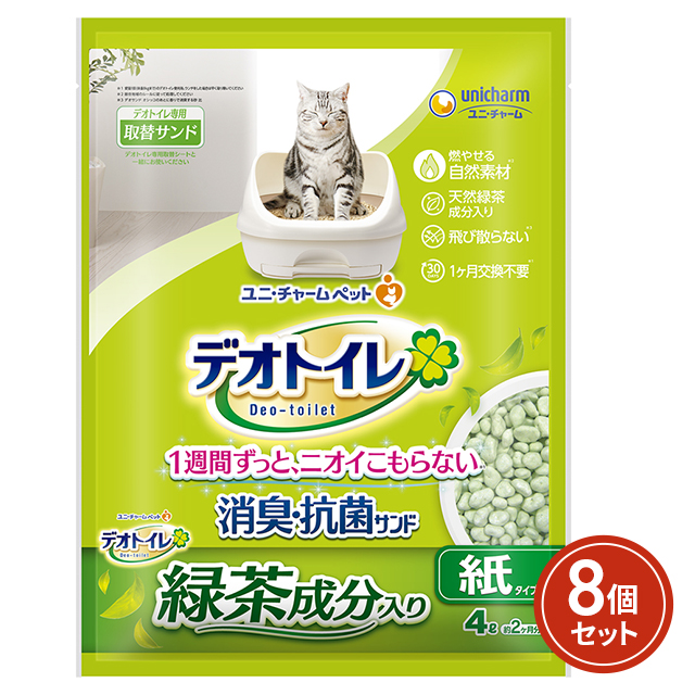 商品名 デオトイレ 緑茶成分入り消臭・抗菌サンド 4L×8袋 (ケース販売) メーカー ユニ・チャーム 容量 4L×8袋 生産国 日本 材質 パルプ、防臭剤、緑茶成分