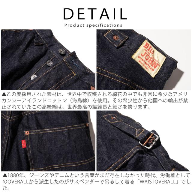 【 ジーンズのルーツ ウエストオーバーオール 】ジーンズ ビッグジョン 海島綿 14オンス セルビッチデニムワイドストレート BIG JOHN WAISTOVERALL ( M101(001) ) アメリカンシーアイランドコットン リラックスフィット ボタンフライ メンズ アーベン