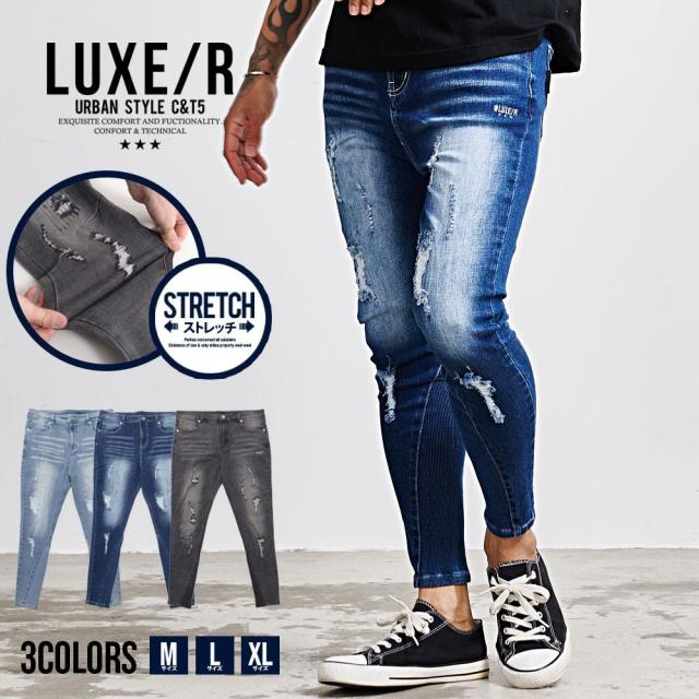 デニムパンツ メンズ ブランド ジーンズ おしゃれ ストレッチ 伸縮性 快適 リブ ヴィンテージ ビンテージ 古着風 ユーズド ダメージ加工 大人 LUXE R ラグジュ ブリーチ ブラック ブルー 20代 30代 40代 ユニセックス 男性 男 服 春 夏 春夏 ファッション [45740]