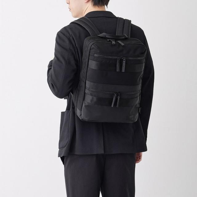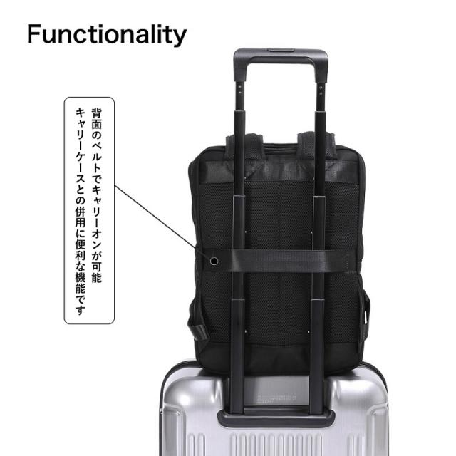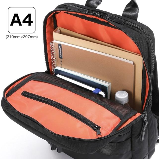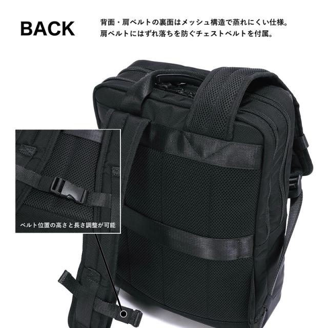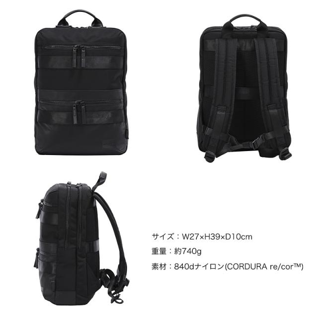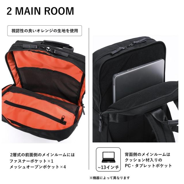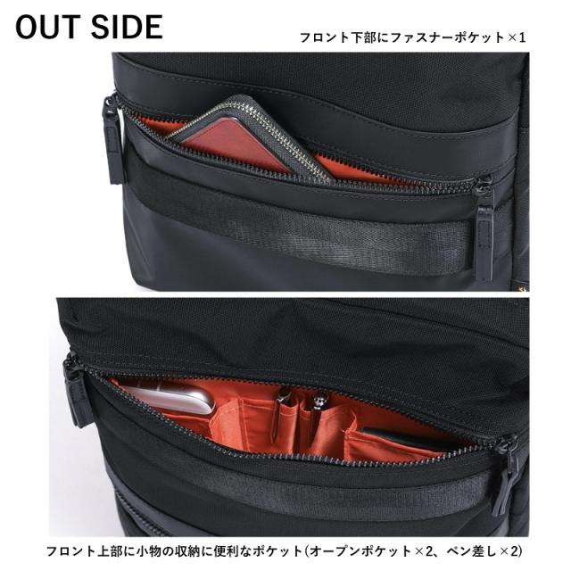 | ポケット | 前ポケット:ファスナーポケット×2(内1つオープンポケット×2、ペン差し×2) 前面側メインルーム:ファスナーポケット×1、メッシュオープンポケット×4 背面側メインルーム:PC・タブレット収納 |