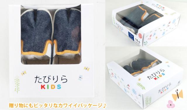 そのまま贈り物としても渡せるカワイイパッケージでお届け♪ 大人とお揃いで足袋靴が楽しめる、たびりらキッズ足袋スリッポンでお出かけをお楽しみください!