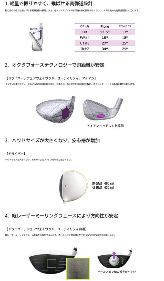 ドライバーは約254gという軽量設計ながら、従来品よりもヘッドを大きくし安心感が増加し、各クラブのロフト角を高めに設定しており、高弾道でやさしく飛ばすことができます。