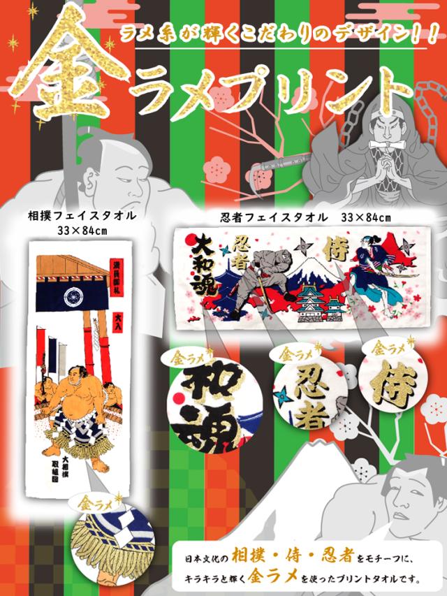 忍者タオル・相撲タオルには日本のモチーフを鮮やかにプリントし、さらに文字&まわし部分がキラキラと輝く金ラメプリントになっています!