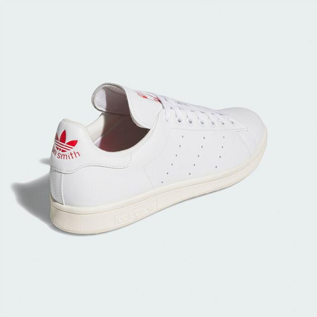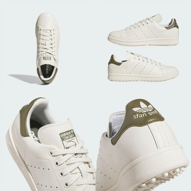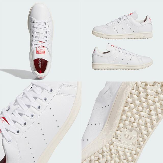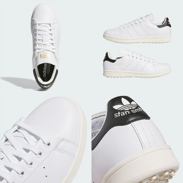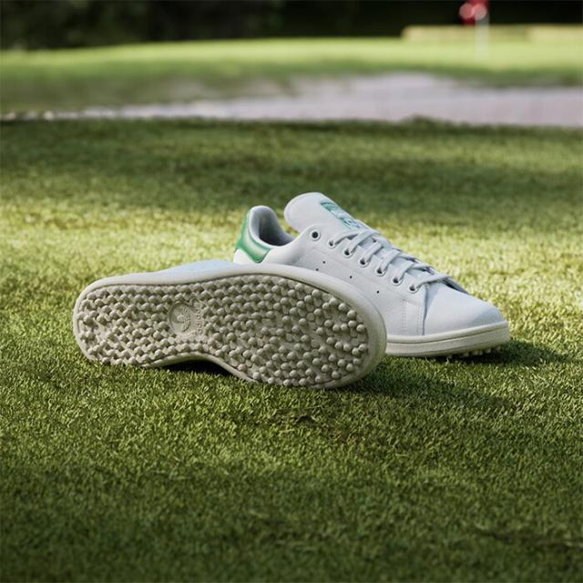 アディダスのアイコニックなスタンスミスをベースに、ゴルフの性能を融合したスタンスミスゴルフシューズ。新たに上質でソフトな素材感に加え、防水性と耐久性のある天然皮革素材をアッパーに採用。スタンスミスゴルフのために専用開発のリサイクルラバースパイクレスアウトソールは、スイング時のグリップ力と汎用性を両立した高い性能になっている。また、シューズ内部にも歩行性能をさらに向上させるために、通常のスタンスミスには無い、追加のクッショニング素材がヒールに搭載されていることで、ゴルフシューズ特有の性能を持つ。