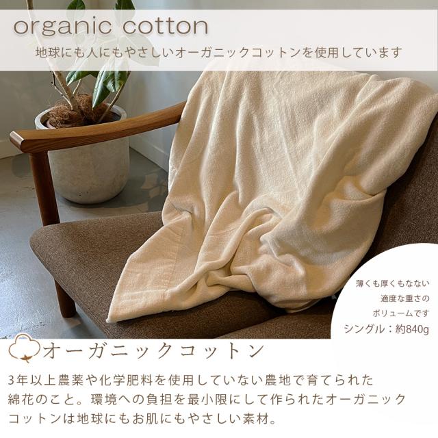 肌がよろこぶ柔らかく優しい肌触り、コットン100%のオーガニックタオルケット。細い糸を使うことで、やわらかさとなめらかさがアップ、気軽に使える心地よさとサラっとベタつきにくい使用感で快適です。軽いのでお子様でも体に負担をかけずにお使いいただけます。薄手のタオルケットがお好きな方に。乾きやすいので、手軽にお洗濯できるのもポイントです。お肌のデリケートな方も安心の綿100%素材。優れた吸水性・吸湿性でしっかり汗を吸収し、ベタつきにくい。