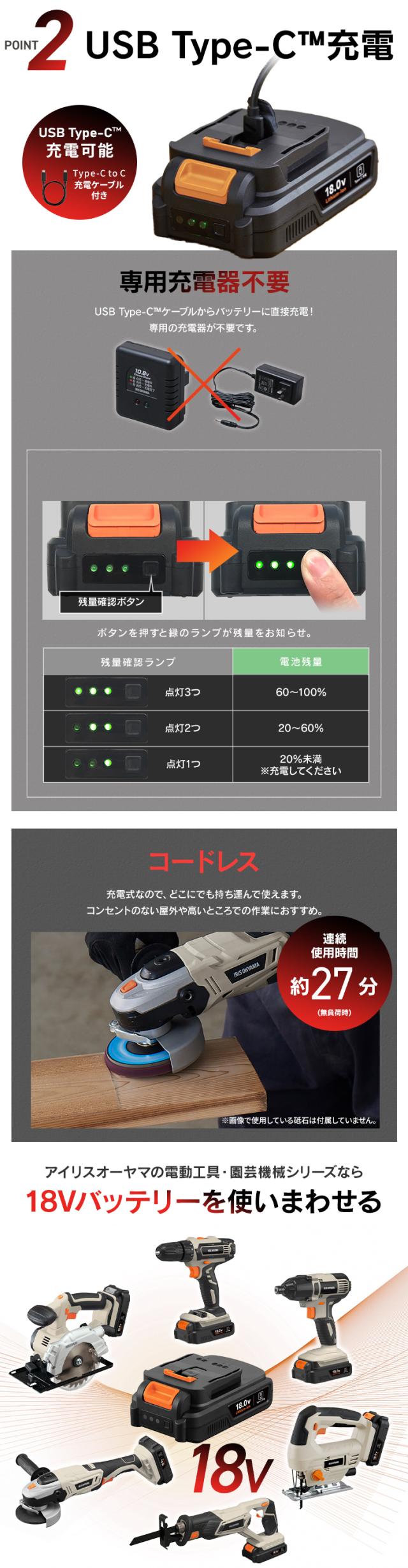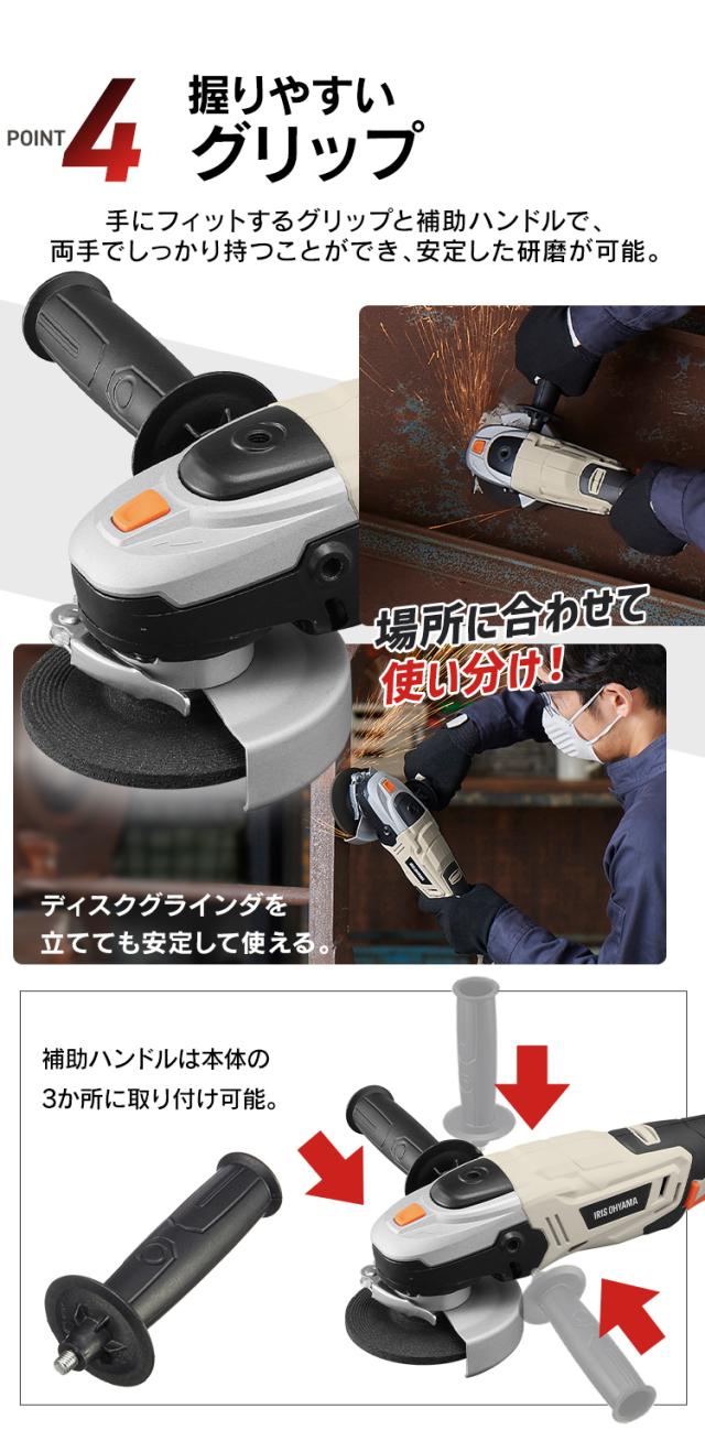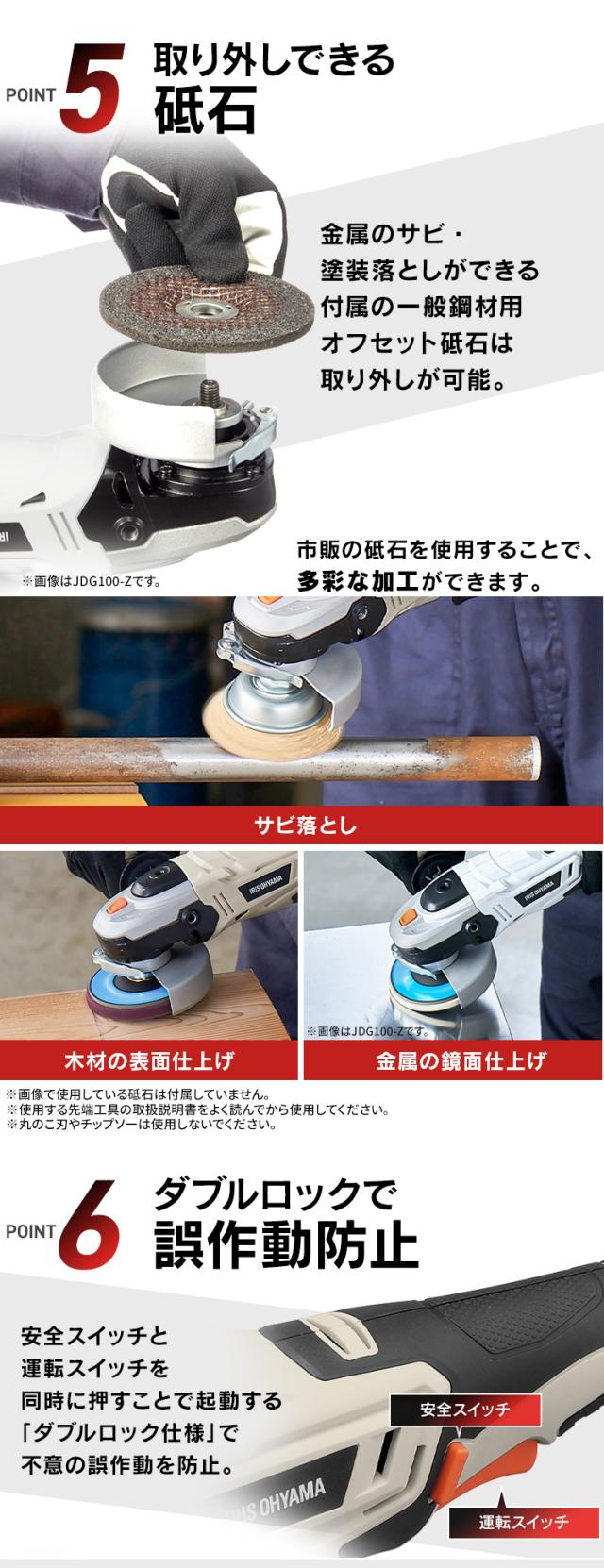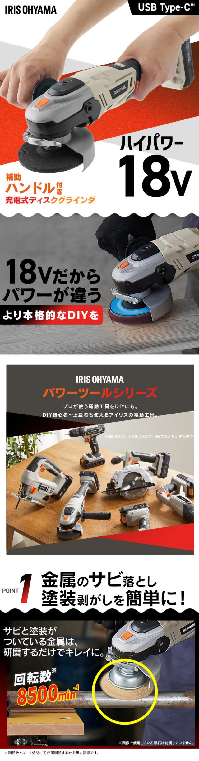 【Type-C充電&バッテリー共用できる】ディスクグラインダー 本体 充電式 18V サビ取り 家庭用 コードレス ハンドル付替可能 砥石 研磨 切断 錆 塗装はがし 電動工具 DIY JDG100TC アイリスオーヤマ *