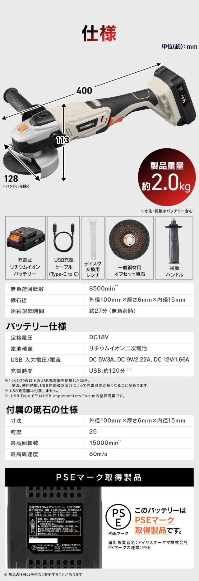 充電式リチウムイオンバッテリー(型番:DBL1820C)、USB充電ケーブル(Type-C to C)、ディスク交換用レンチ、ワッシャー、ロックナット、補助ハンドル、一般鋼材用オフセット砥石