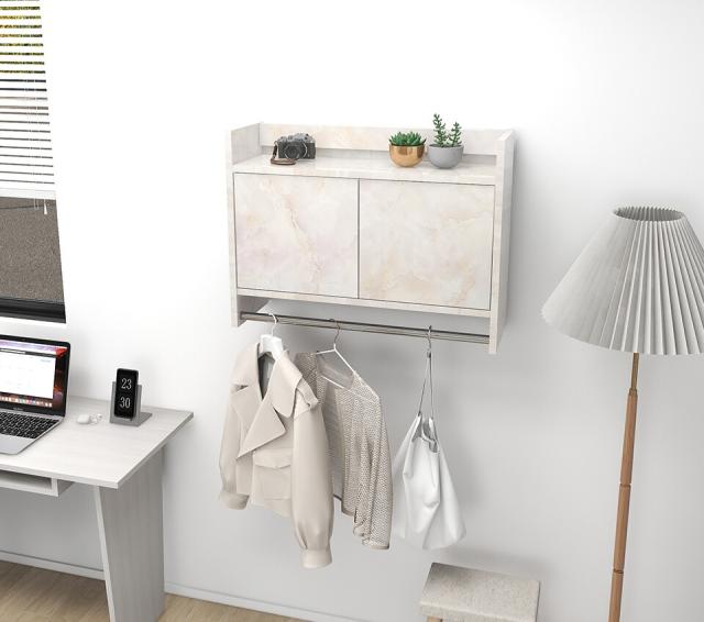 壁掛けハンガーラック ウォールシェルフ ハンガーラック コートハンガー ウォールラック 棚付き 大理石柄 玄関 扉付き 洗面所 キャビネット 壁掛け 石膏ボード 完成品 ポールハンガー 高級感 おしゃれ 日本製 ハンガーバー 北欧 壁に付ける リビング収納 賃貸 幅80cm ★