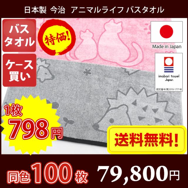 【送料無料】同色100枚セット(個包装なし) 日本製 今治タオル アニマルライフ バスタオル 600匁 薄手 / 今治 タオル バス 国産 ネコ ハリネズミ