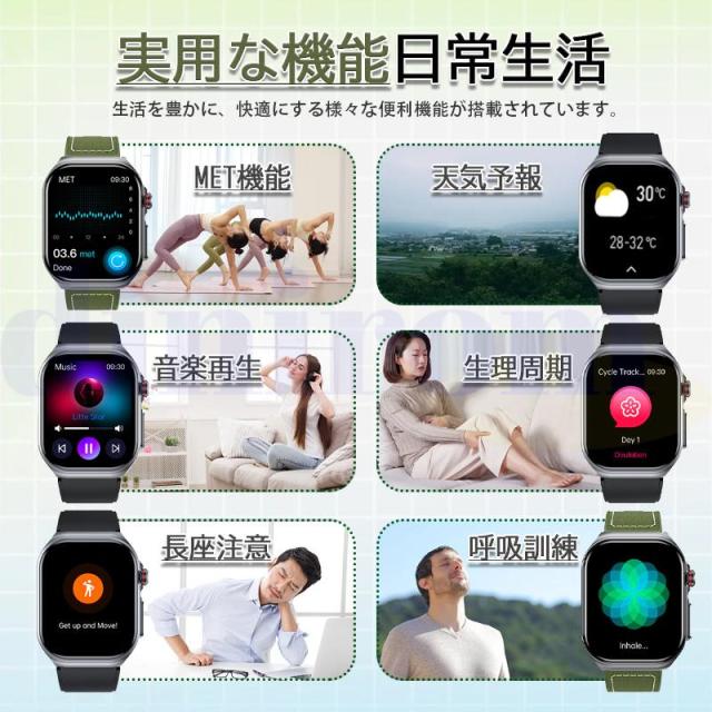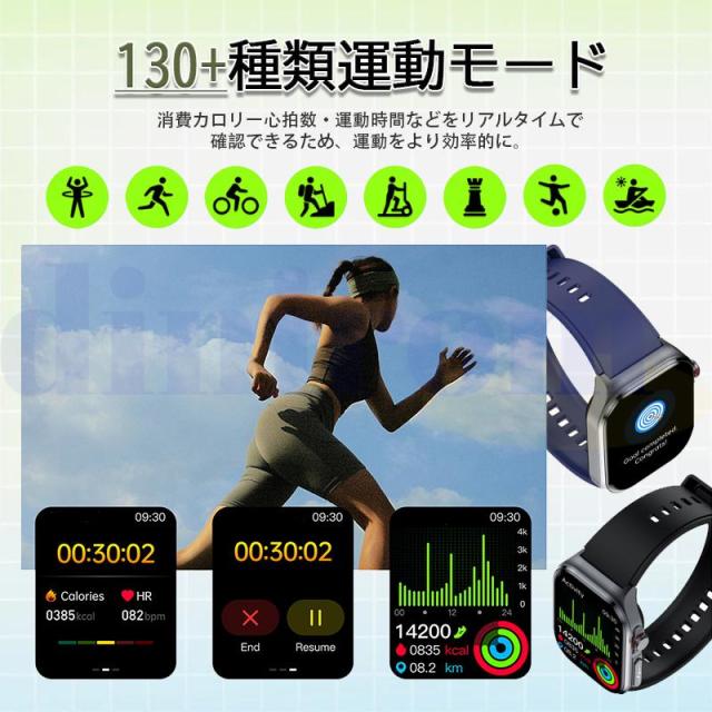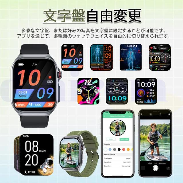 このスマートウォッチは業界初の2.04インチ大画面のタッチパネルを採用し、老眼の方にも見やすい!画質がより鮮明になり、高精度な大画面で通知や文字が一目瞭然に表示される。上下左右のスライド操作で機能の切替も簡単です。本体で6つの表盤画面搭載する以外、専用アプリで150+種類の文字盤を自由に設定することができます。他に、家族、恋人、アイドル、及びペット等の好きな写真も文字盤に設定可能で毎日新鮮さを味わえる。