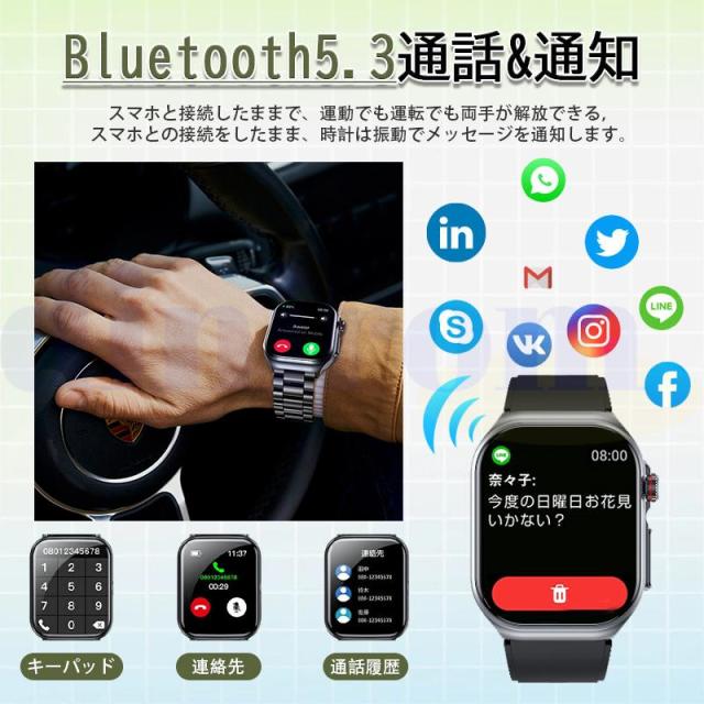 スマートウォッチには最新のBluetooth 5.3テクノロジーが搭載されており、安定性とエネルギー効率が大幅に向上しています。Bluetooth接続後、同期モバイル通信をサポートし、通話記録を保存できます。運動中に簡単に電話に出ることができます。最も重要なことは、いつでも時計を通じて自分の情報を確認できることです。Android 5.0/ IOS 10.0 システムのスマートフォンと簡単にマッチングできます。音声アシスタントにも対応しているので、スマホを取り出さなくてもスマートウォッチの音声アシスタント画面から電話をかけることができます。