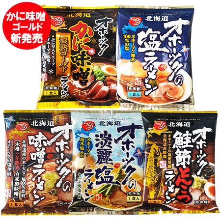 オホーツクの塩 ラーメン 送料無料 オホーツクの塩ラーメン / オホーツクの淡麗塩ラーメン / オホーツク鮭節とんこつラーメン / オホーツクの味噌ラーメン / オホーツク かに味味噌ラーメン 各1袋 計5袋 袋麺 乾麺 ラーメン スープ付 つらら ラーメン 麺類