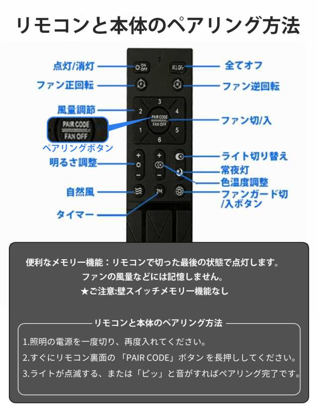 | 【注意事項】 | 当店のシーリングファンが首振り機能がありません、ご注意くださいませ。ご購入前に天井の配線器具の確認をしてください。天井に穴開け必要がありませんが、配線器具により取付け方が異なります。必ず天井の強度をご確認ください。 ●取付けアタッチメント:引掛埋込ローゼット、角型引掛シーリングボディなど ※引掛けが異なり、またフックも何センチの厚みがあり、シーリングのフックと配線器具の間に隙間が出る場合がございます。 ※適切な羽の高さ:床から220〜250cm ※リモコン付き(単4電池×2個必要※電池は付属していません) |